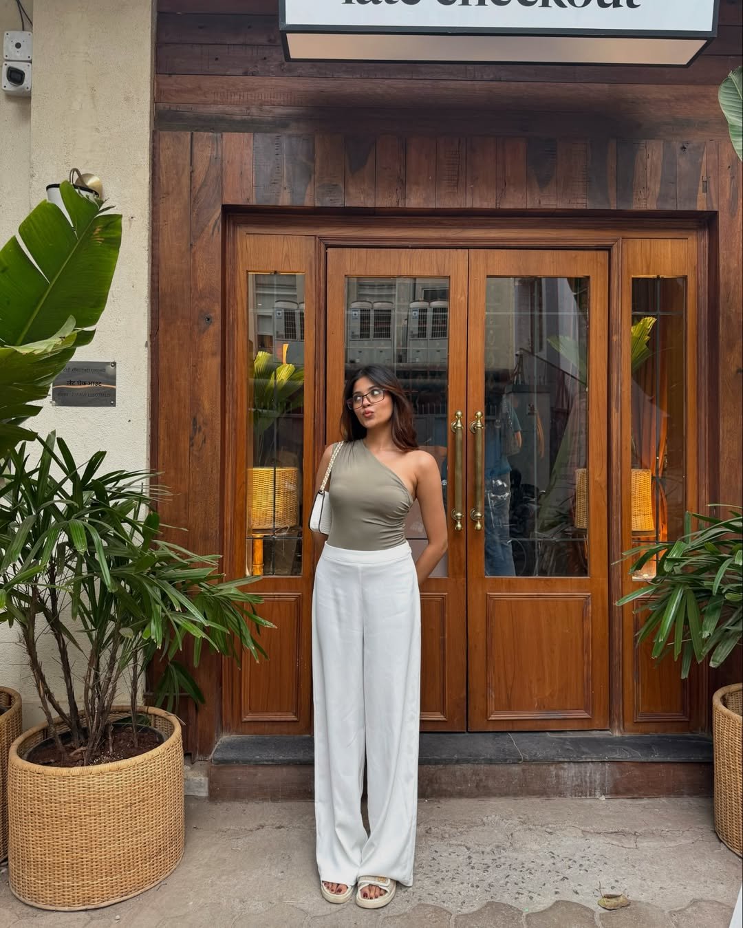 A one-shoulder top with crisp white trousers instantly feels modern and fresh. The soft taupe tone up top keeps things grounded, while the wide-leg pants bring that effortless flow we all crave in spring.
