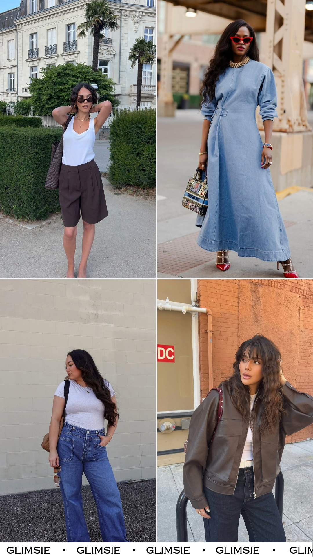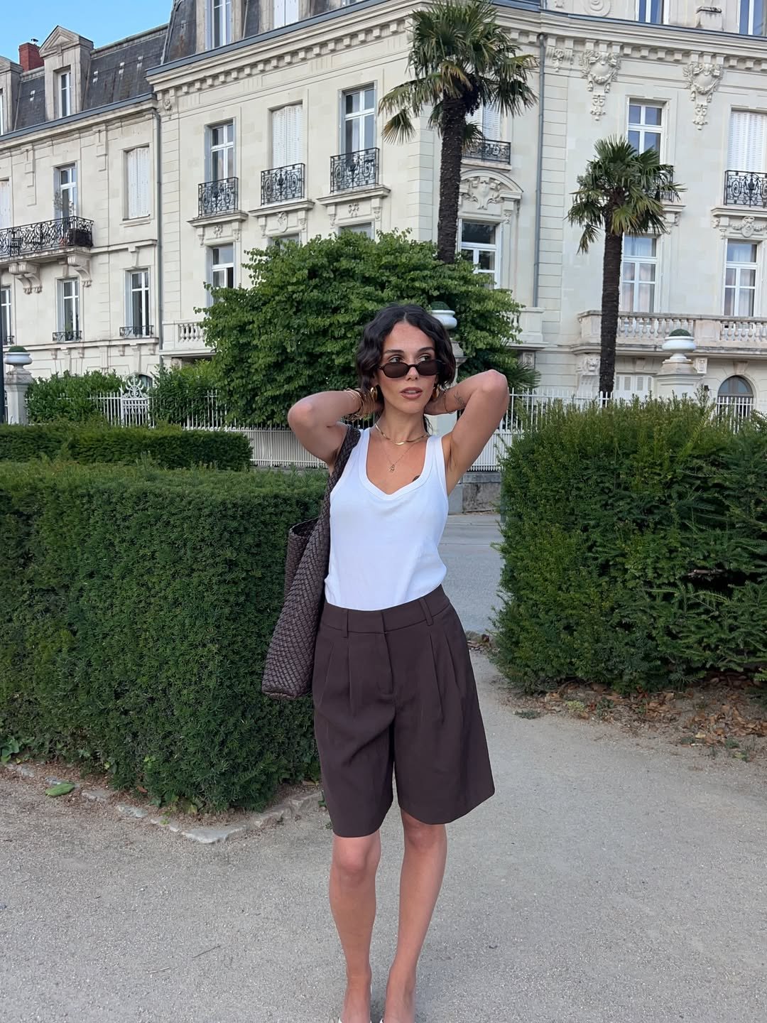 This look is all about quiet confidence. A crisp white tank meets tailored chocolate-brown bermuda shorts, finished with sleek sunnies and a woven shoulder bag that screams “casual but curated.” It’s giving spring-in-Paris energy, even if you’re just grabbing coffee down the street.