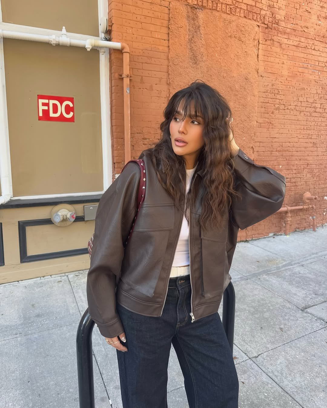 A cropped leather jacket over dark denim instantly sets the tone — edgy but wearable. The soft waves and neutral top balance out the toughness, creating that perfect city-girl contrast.