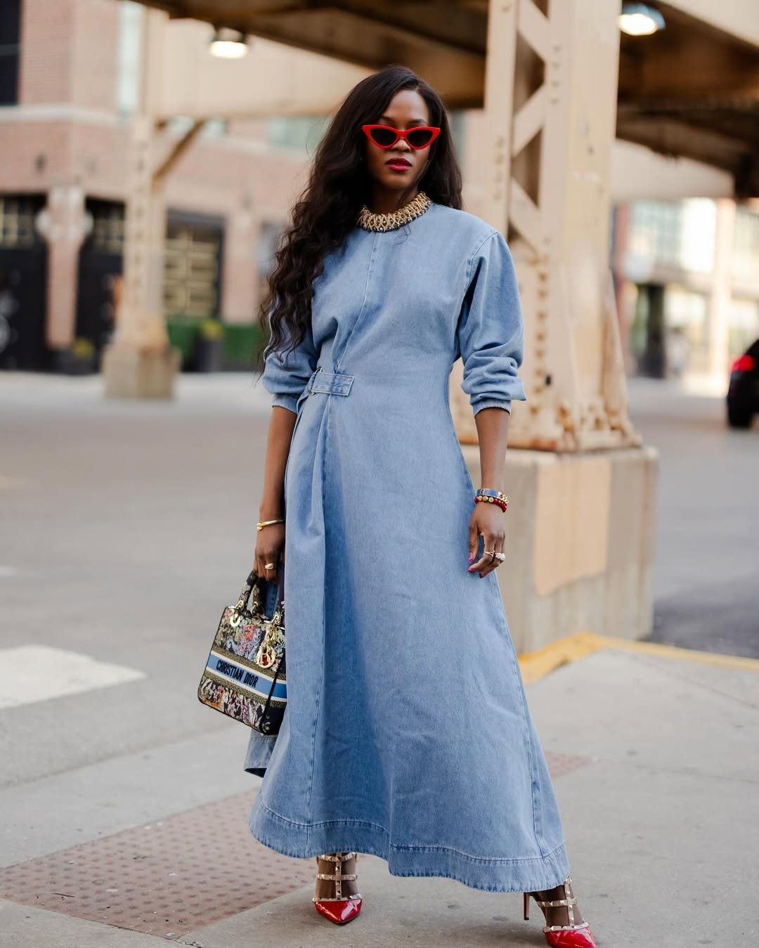 Now this is how you make denim feel elevated. The belted chambray maxi dress brings structure, while bold red heels and statement sunglasses turn the sidewalk into a runway.