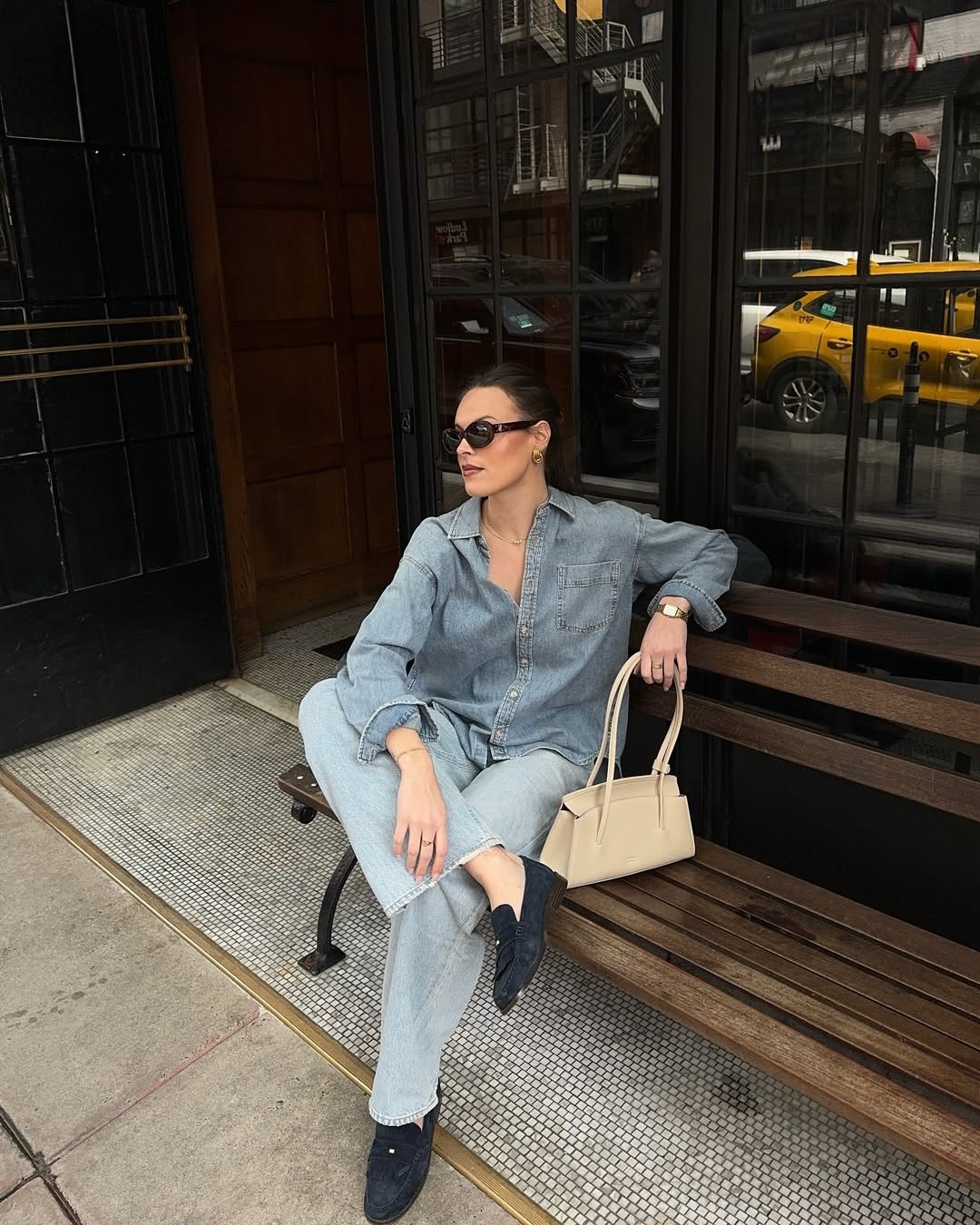 Canadian tuxedo, but make it chic. The relaxed denim shirt with matching jeans feels effortless, especially styled with sleek loafers and a structured neutral bag.