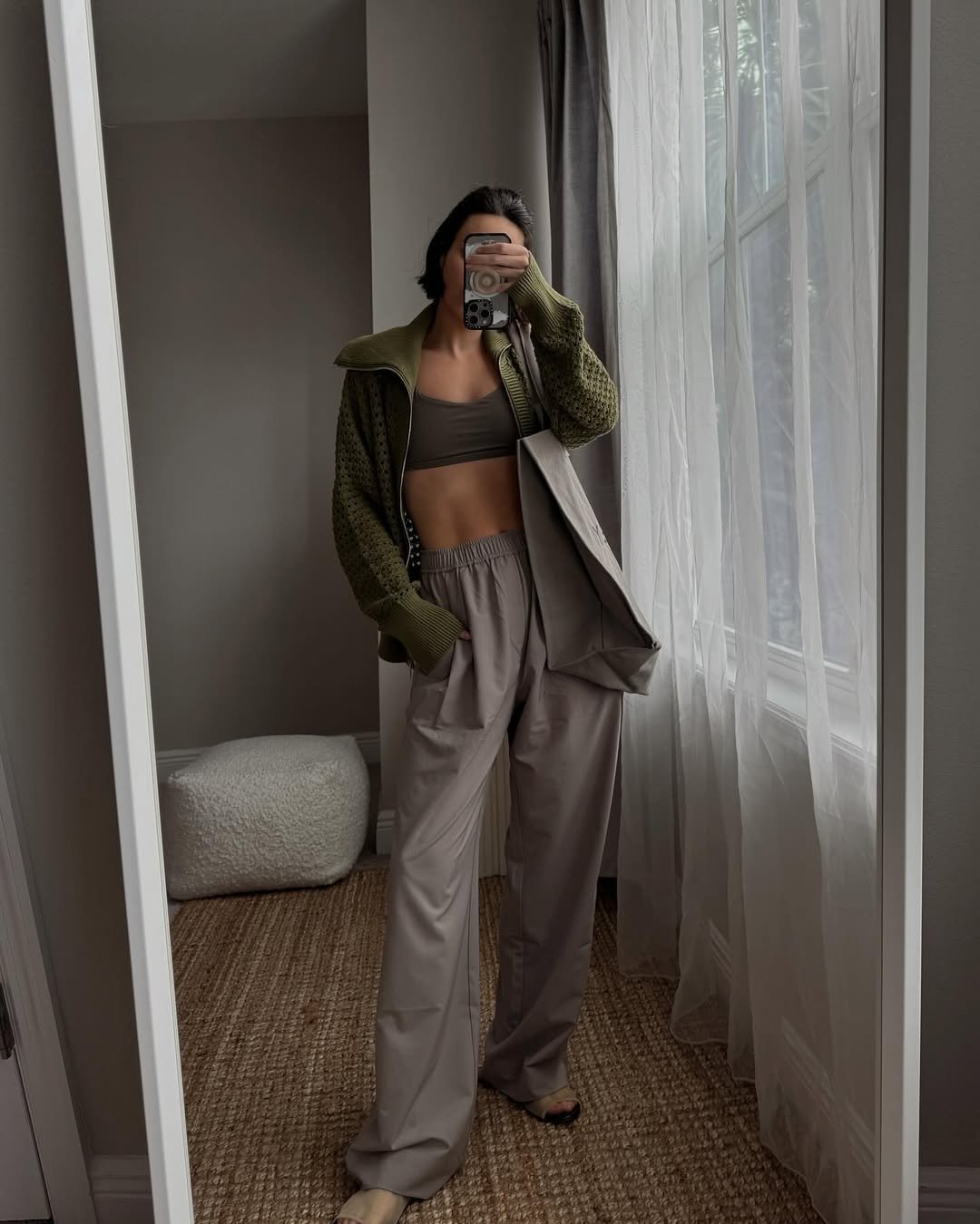 Sporty meets stylish here, and honestly, it works. Relaxed trousers, a cropped top, and a textured cardigan create that “model off-duty” energy we all secretly love.