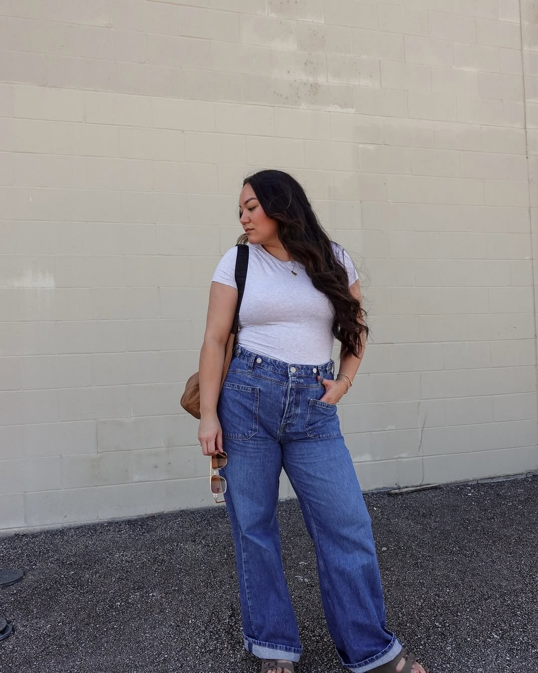 A fitted white tee tucked into high-rise jeans is a forever favorite, and this version nails the formula. The backpack and casual sandals keep things relaxed, while the silhouette stays flattering and clean.