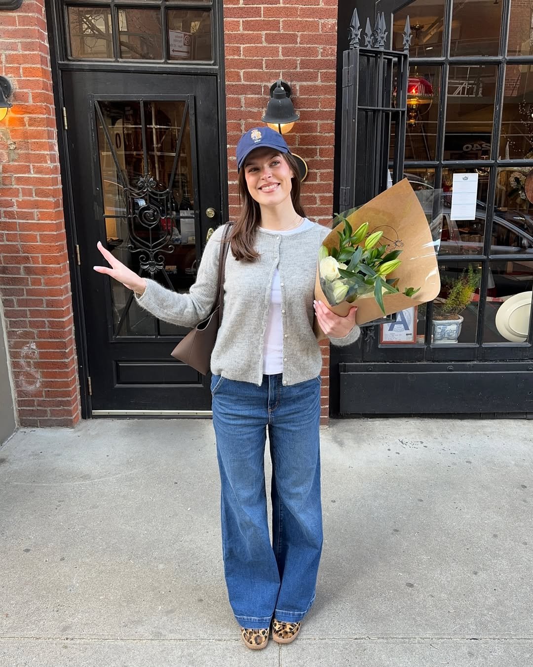 There’s something instantly happy about this outfit. A cozy cardigan over a simple tee, classic jeans, and a baseball cap — topped off with fresh flowers like the ultimate spring accessory.