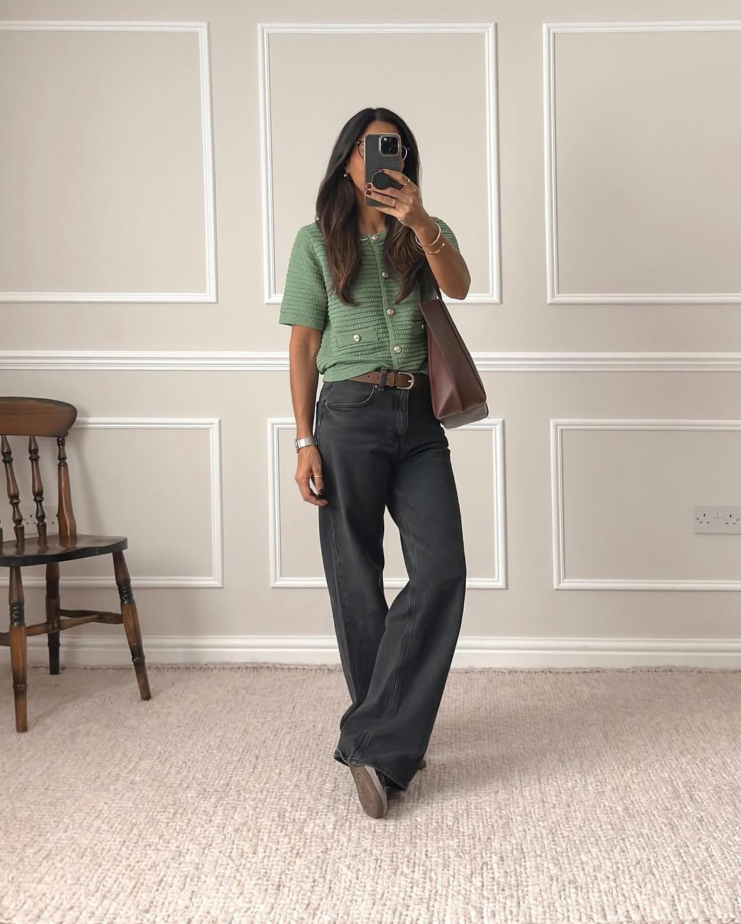 That textured green top paired with dark jeans is such a refreshing combo. Simple accessories and a roomy tote make it practical, while the color choice keeps it feeling spring-forward.