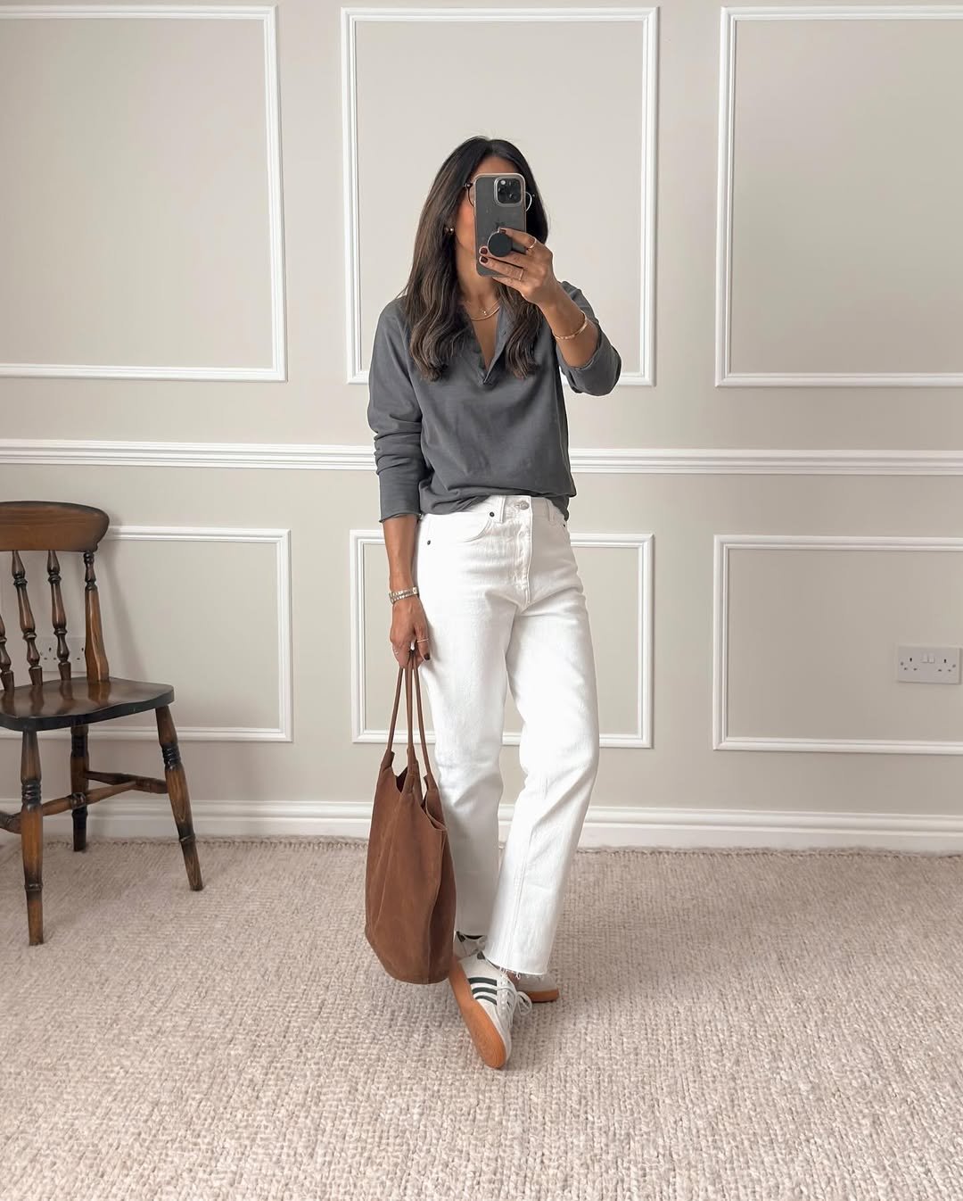Ending strong with a grey long-sleeve and white jeans — a timeless March pairing. Sneakers keep it casual, while the tote adds that everyday-life realism we love.