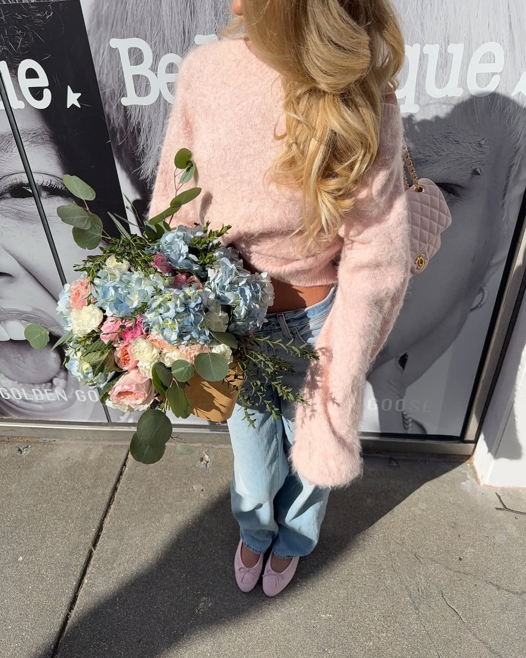 That fuzzy blush sweater with light-wash denim is pure spring romance. Add pastel flats and a bouquet in hand, and suddenly everything feels softer and brighter.