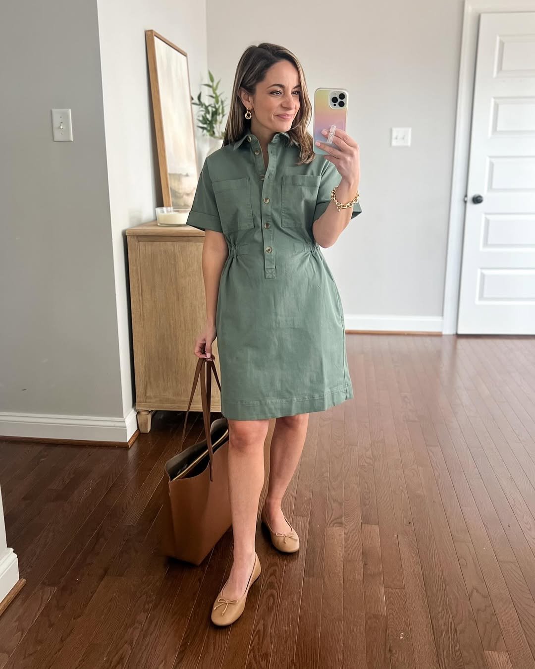 This sage green shirt dress is doing all the heavy lifting here. Structured enough to feel polished, relaxed enough for everyday life — plus those neutral flats and roomy tote make it quietly practical in the best way.