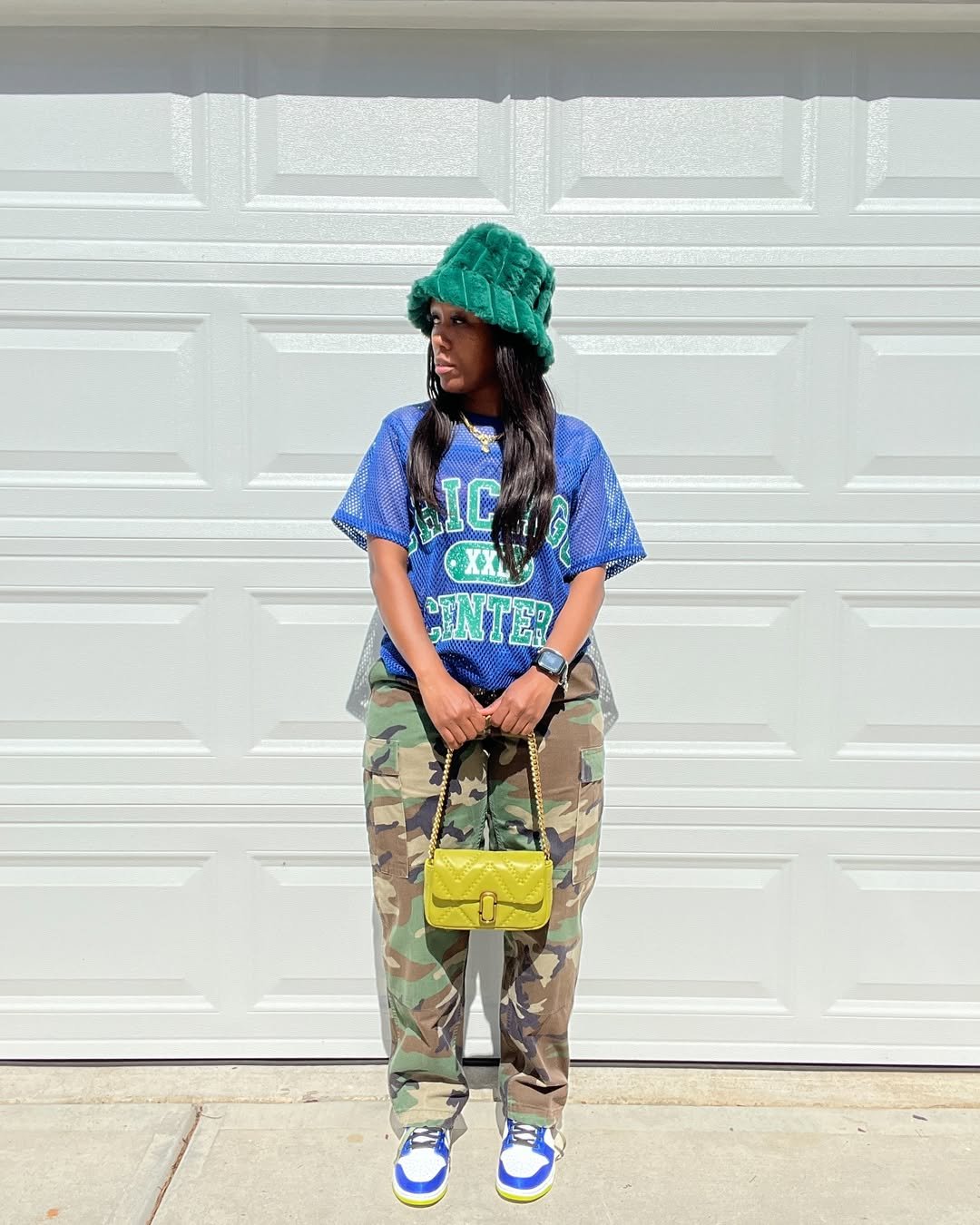 Camo pants paired with an oversized graphic tee and fuzzy green bucket hat brings serious personality to this outfit. Add colorful sneakers and a bright mini bag, and suddenly the whole look feels playful and bold.
