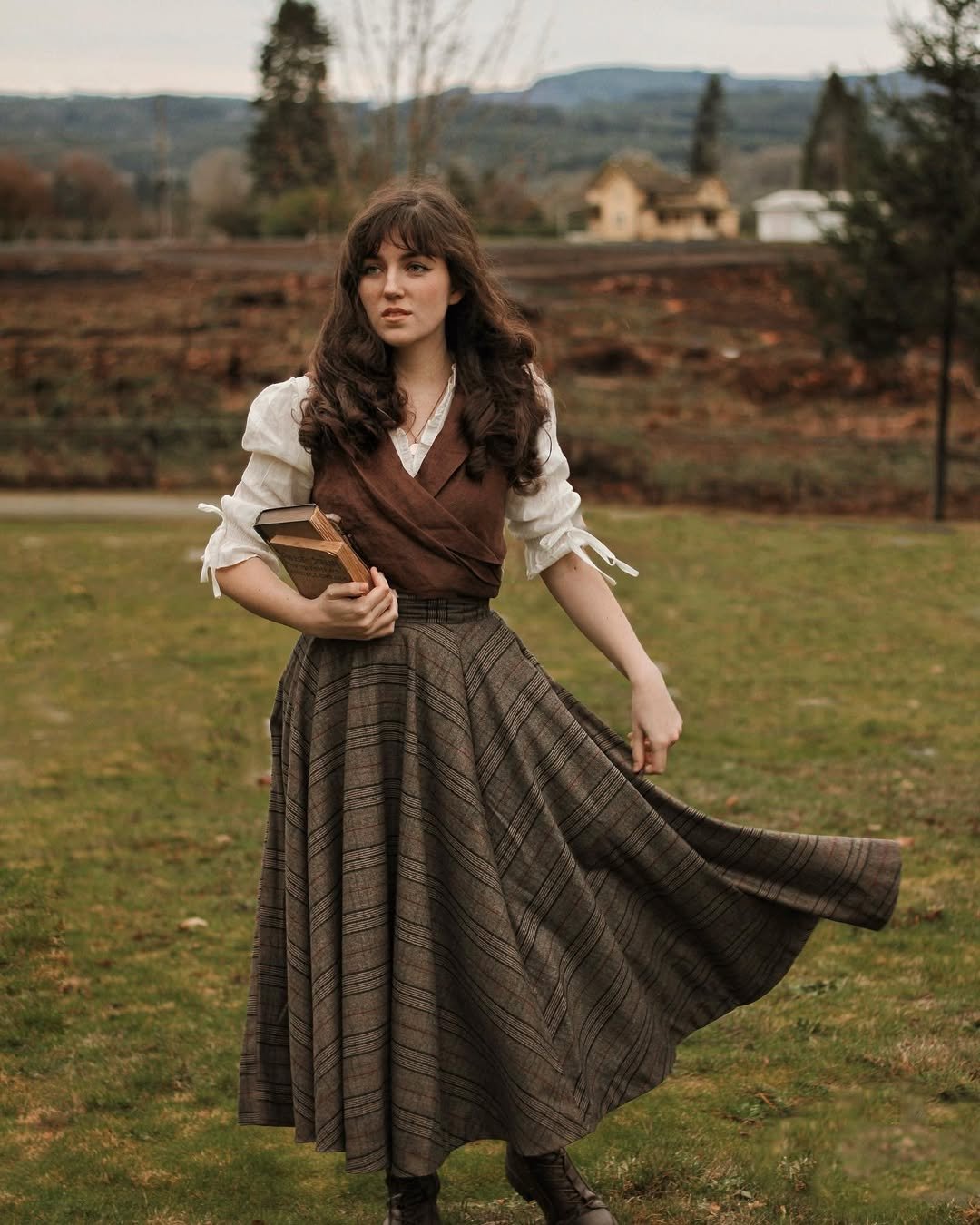 This look feels straight out of a novel. The blouse, vest, and flowing skirt bring old-world charm, while the boots keep it grounded and wearable.