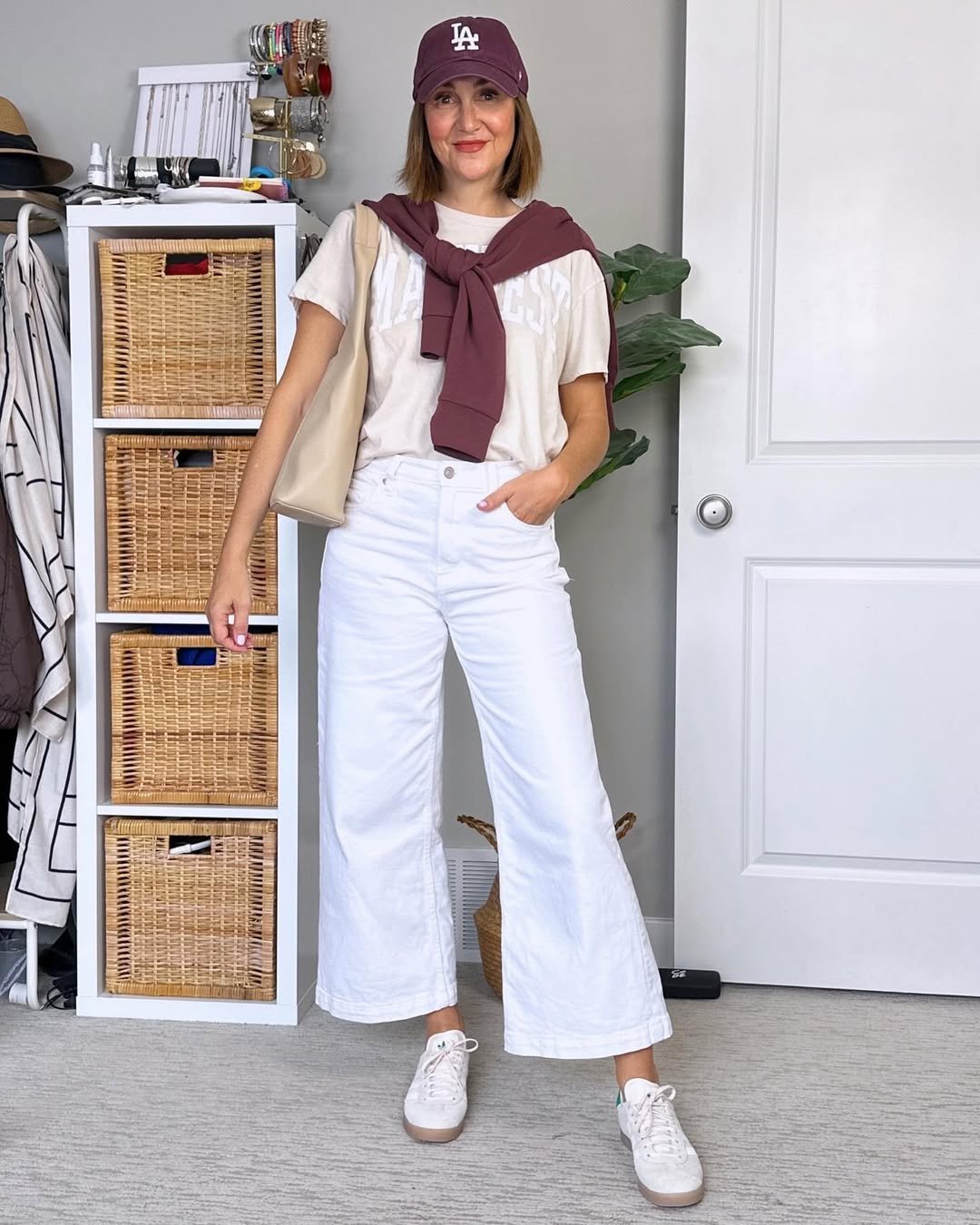 White wide-leg jeans, a soft tee, and that burgundy cap + sweater combo? Instant cozy-chic. This outfit feels like your favorite Saturday uniform — comfy enough to run errands, polished enough to meet friends for lunch.