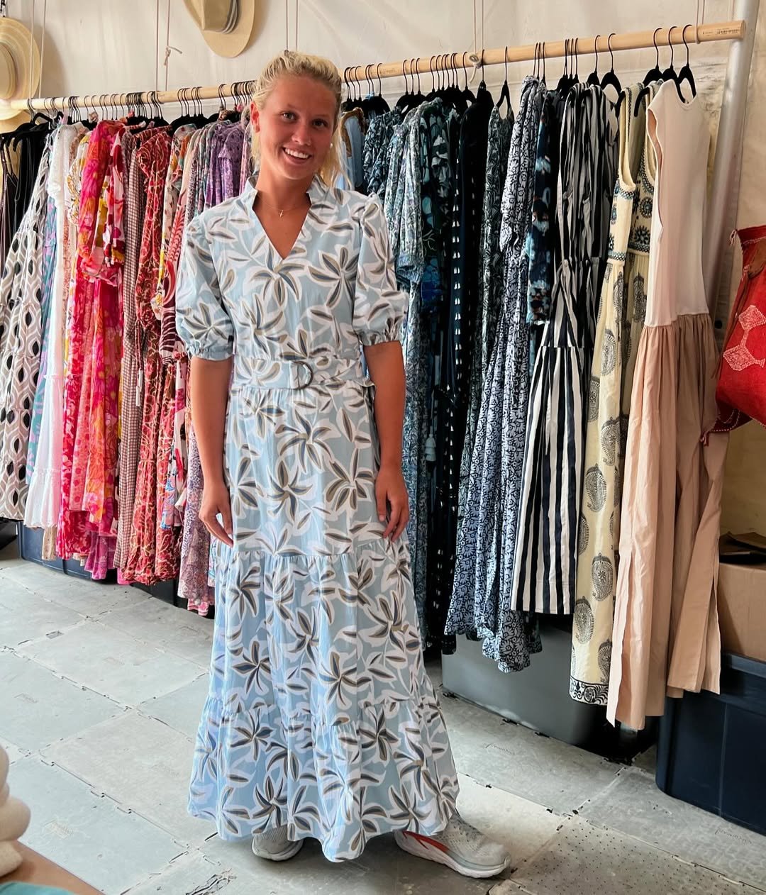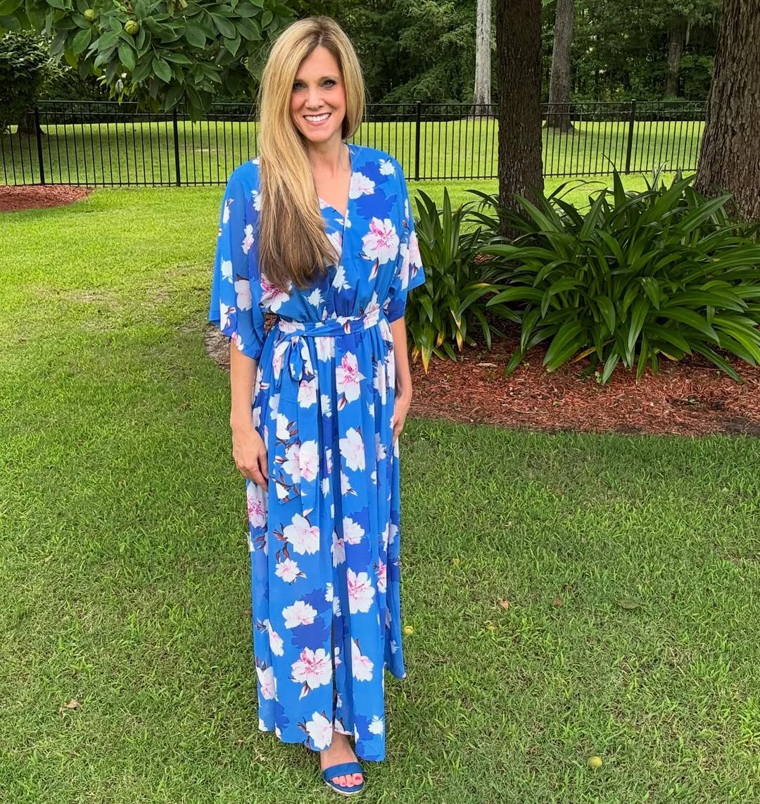 There’s a relaxed charm to this look that feels instantly approachable. The soft blue print paired with a flowing shape creates that easy, breezy movement you want in a maxi dress.