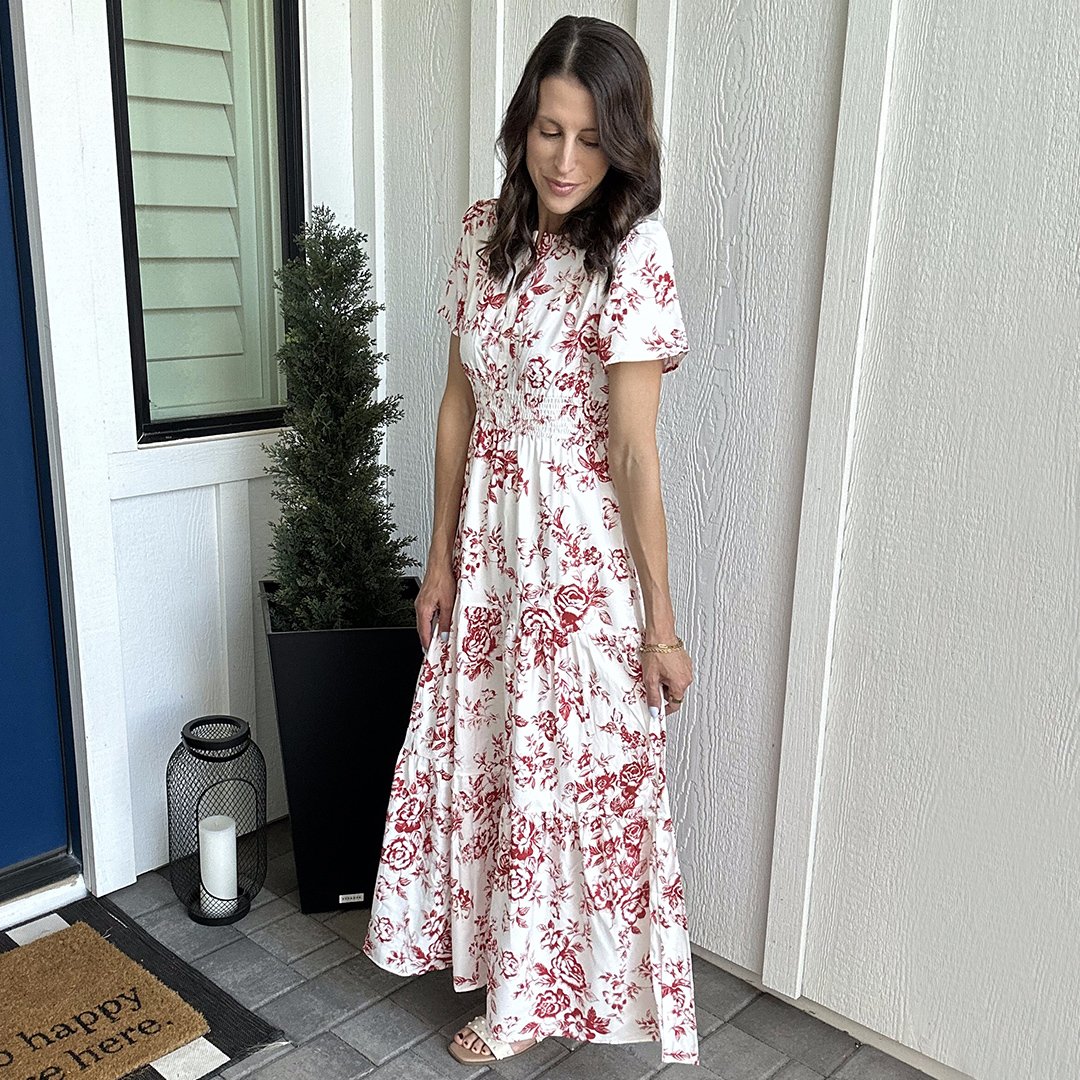 This look feels like a familiar favorite. The wrap-style silhouette flatters without trying, while the floral print keeps it light and seasonal.