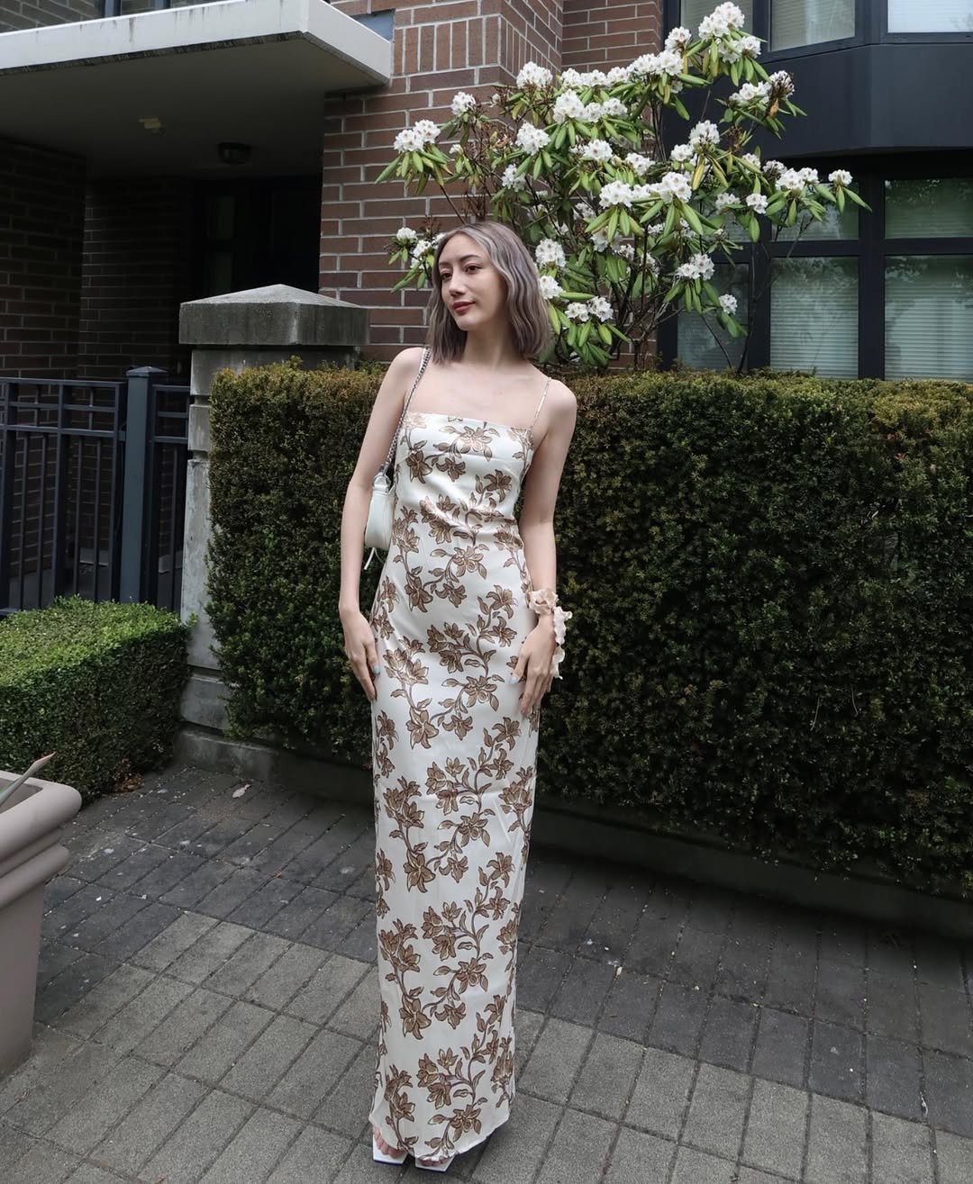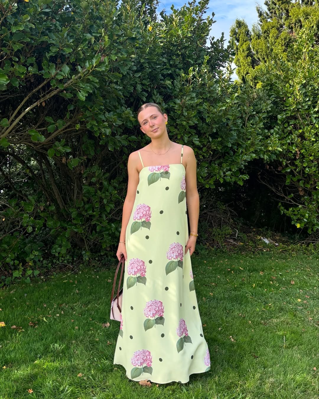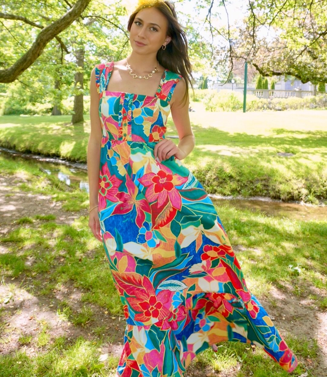 This dress feels like summer in full color. The bold floral print moves so effortlessly with every step, catching light between the trees and turning a simple walk into something a little more cinematic.