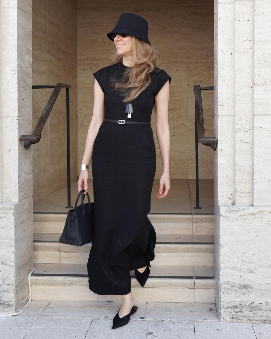 The accessories stay subtle, letting the dress do the work. It’s the kind of outfit that slips seamlessly from day to evening, always looking right without trying too hard.