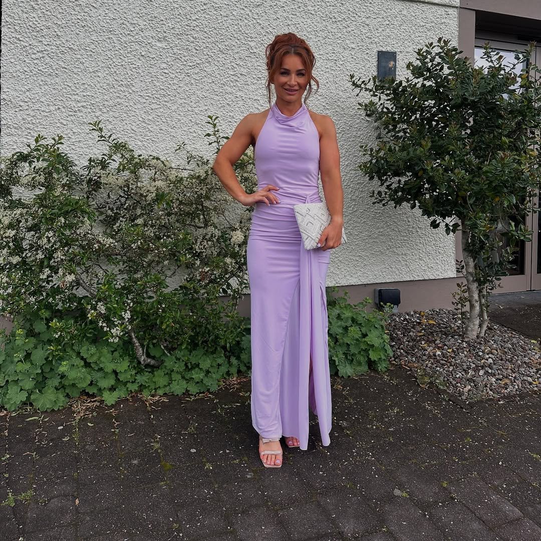 This look brings a sleek, sculpted energy to the maxi dress. The fitted silhouette paired with that soft lilac tone feels fresh, almost unexpected, but still refined.