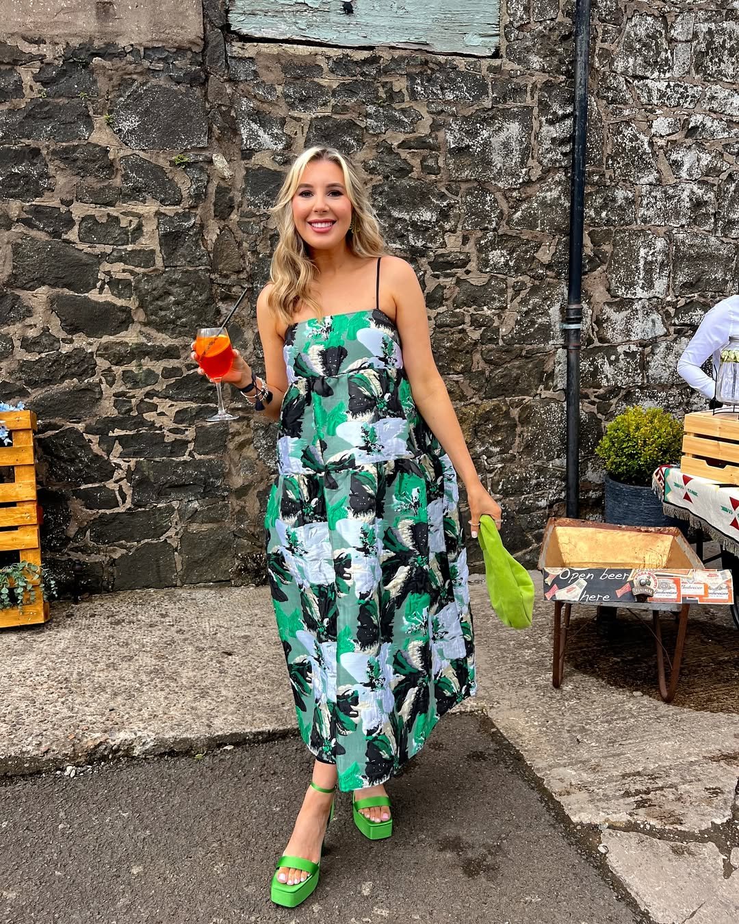 This look feels like a little celebration in motion. The bold green tones paired with that abstract print bring energy without feeling chaotic, especially with those matching heels tying everything together so neatly.