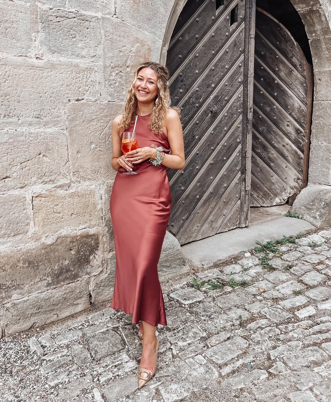 This one feels like golden hour bottled into a dress. The soft satin finish in that warm terracotta tone reflects light in the most flattering way, adding just enough glow without any extra effort.