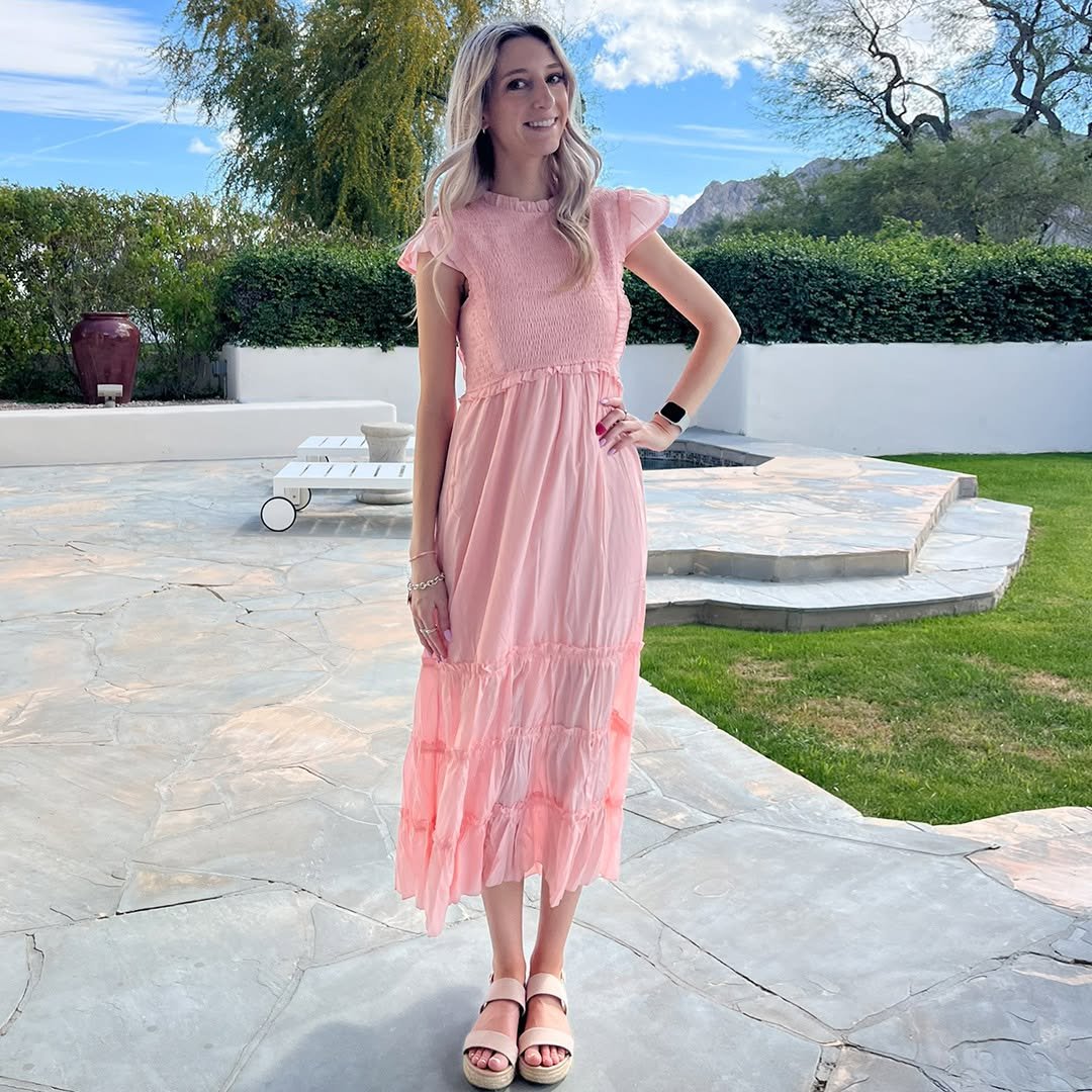 This look leans into texture in the most charming way. The tiered design, finished with delicate ribbon details, gives the dress a soft structure that feels thoughtful without being fussy.