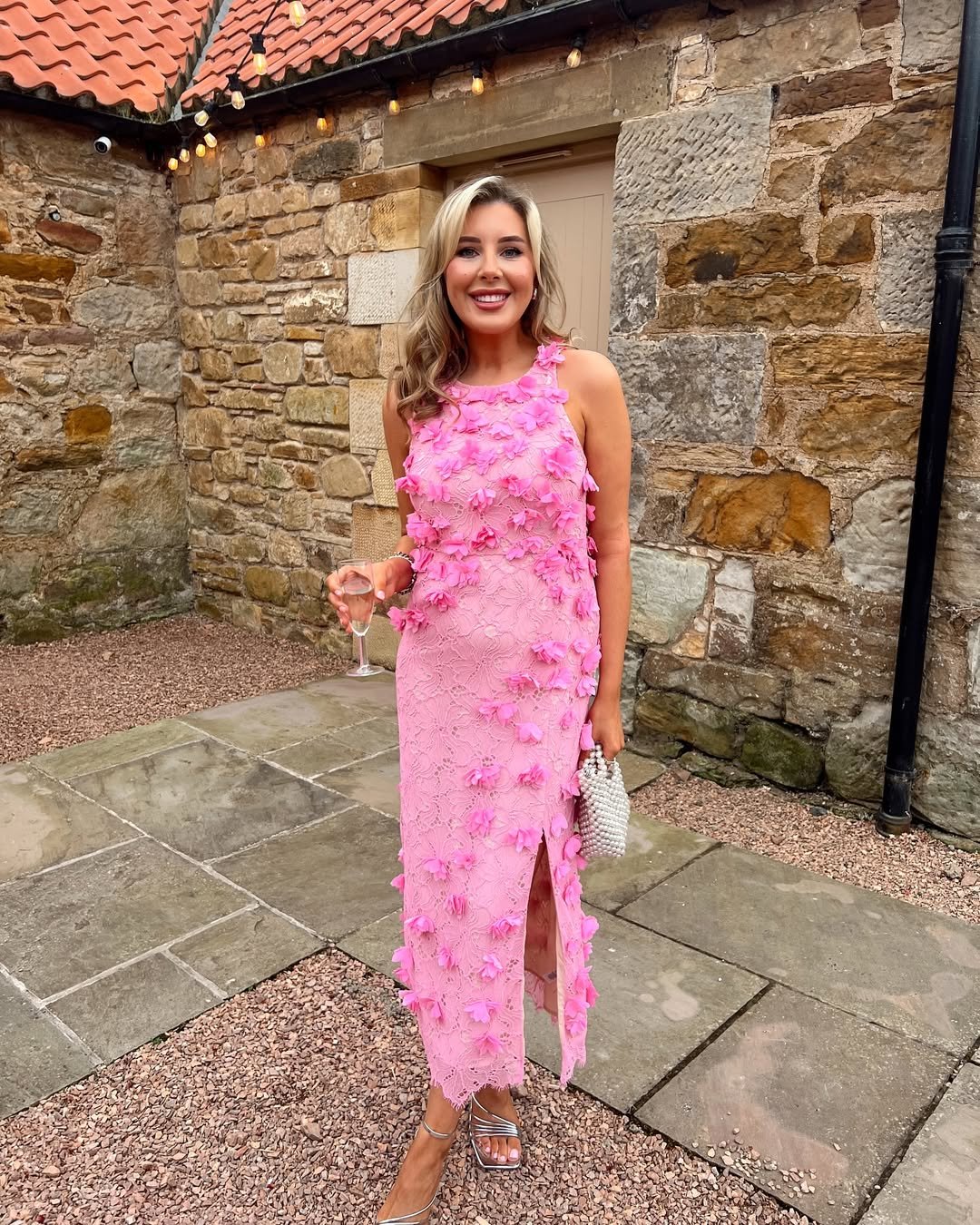 There’s something about this dress that instantly feels special. The soft pink base layered with delicate floral appliqué gives it dimension, catching light in a way that feels almost romantic.