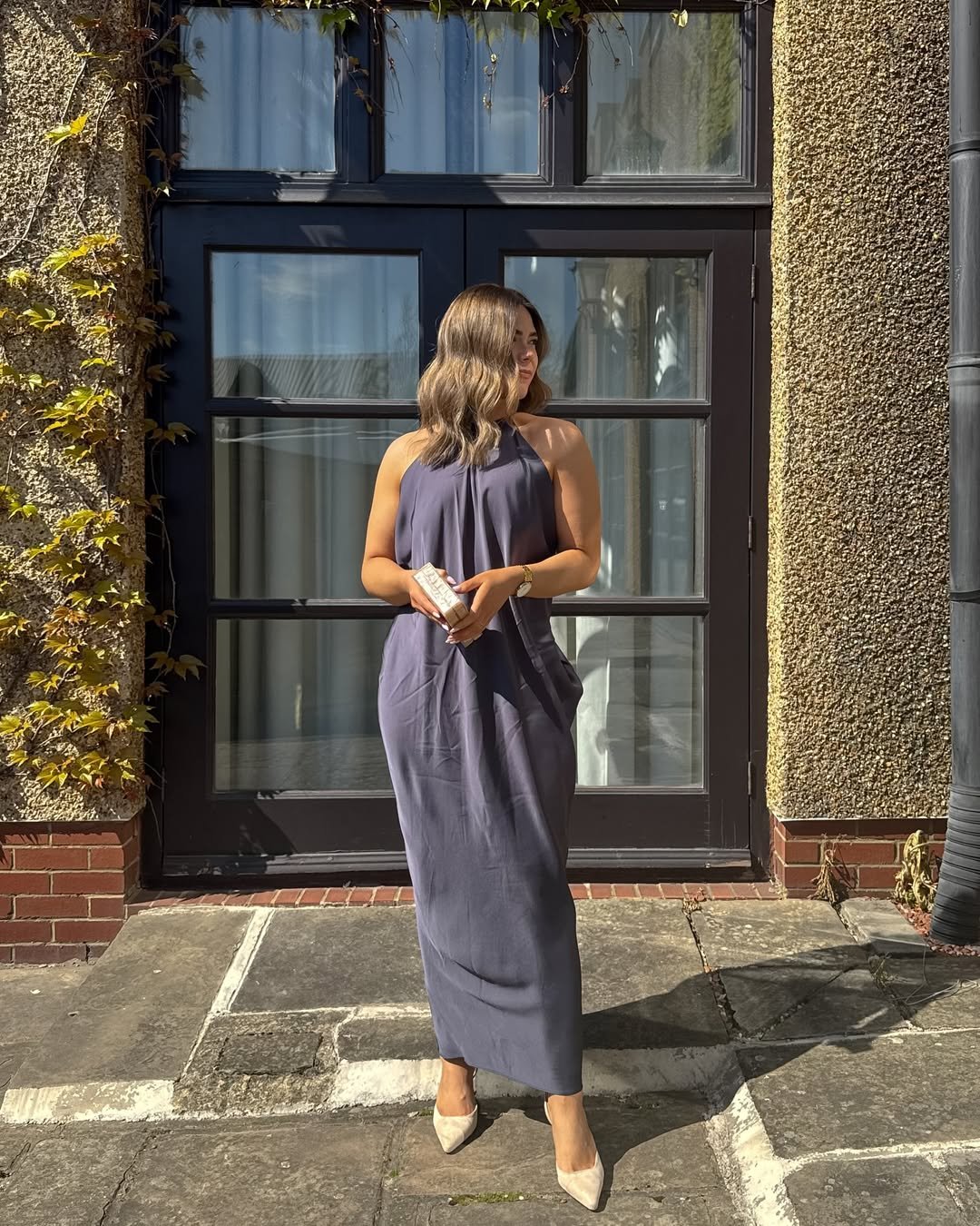 There’s a quiet elegance to this look that feels almost cinematic. The soft slate-toned maxi drapes effortlessly, catching light just enough to show its movement without ever demanding attention.