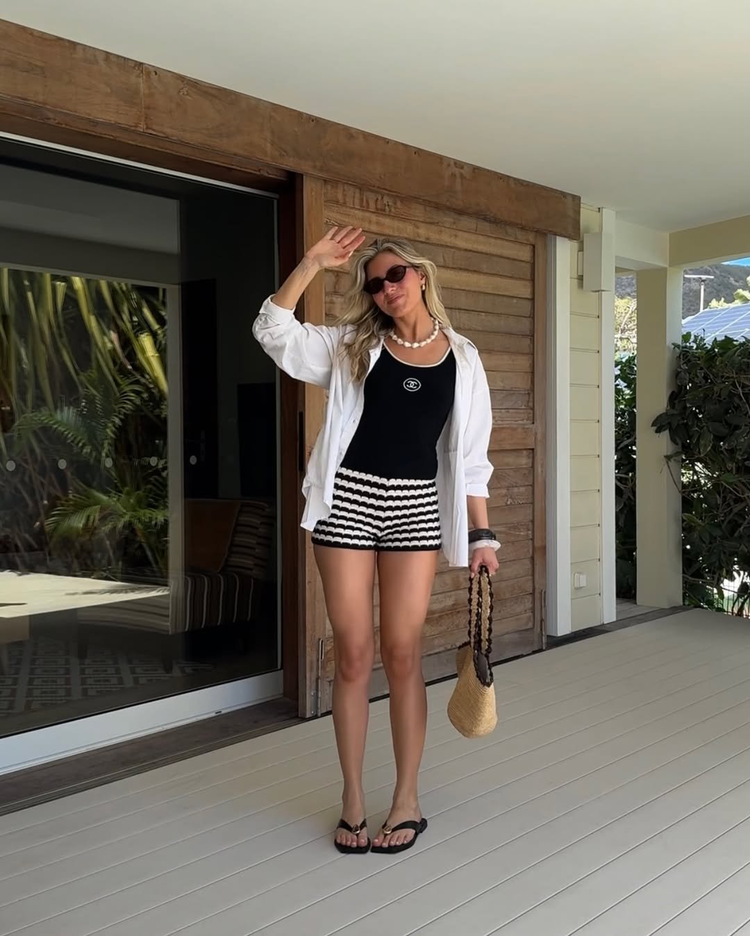A black tank with patterned shorts and an open shirt feels like the ultimate relaxed summer uniform. It’s easy, breathable, and quietly styled.