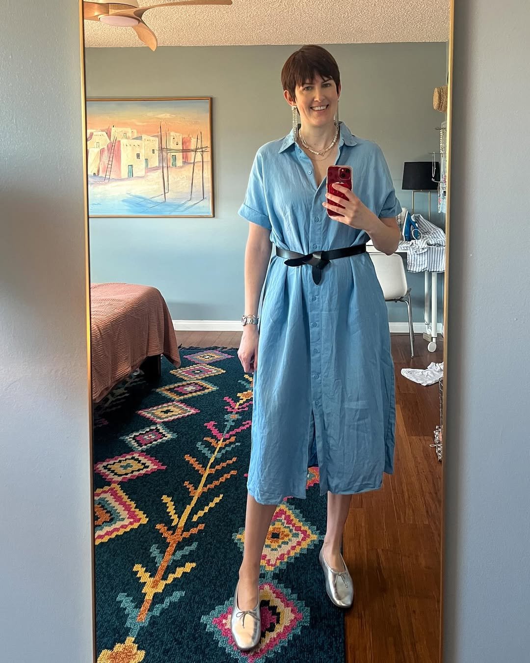 A soft blue shirt dress cinched at the waist creates shape while keeping things relaxed. The fabric moves easily, making it perfect for everyday wear.