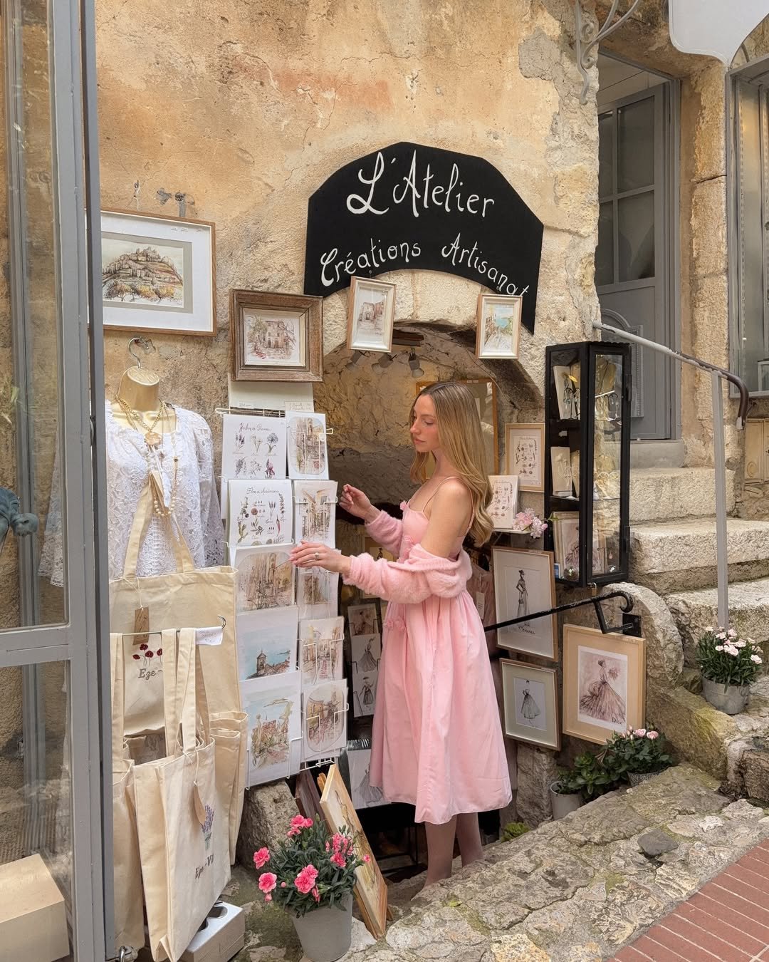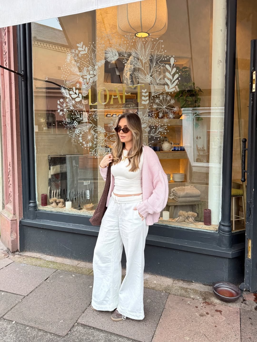 There’s a cozy charm in pairing wide white trousers with a soft pink cardigan, especially when styled against a warm storefront. The look feels relaxed but intentional, like a morning coffee that turns into a wander through the neighborhood.