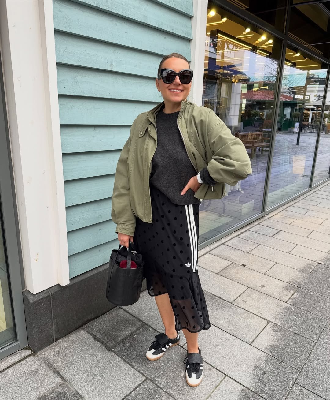 This mix of a flowy black skirt with sporty sneakers and a relaxed jacket feels modern in the best way. There’s movement, texture, and just enough contrast to keep things interesting.
