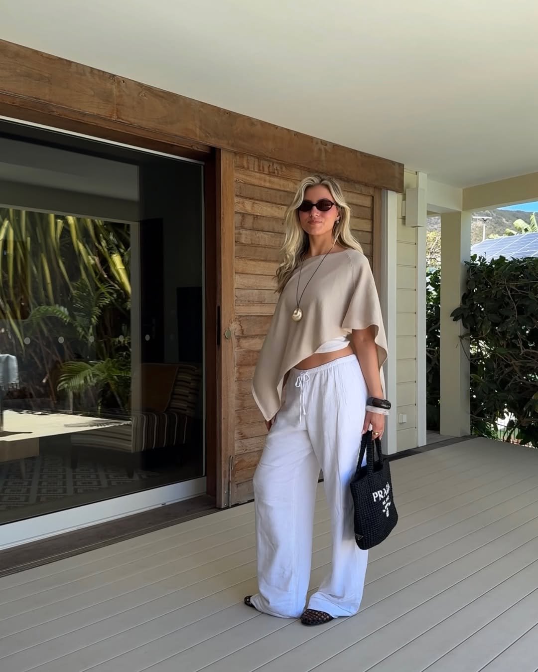 Flowy white trousers paired with a draped neutral top create a calm, resort-ready feel. The layers move softly, catching light with every step.