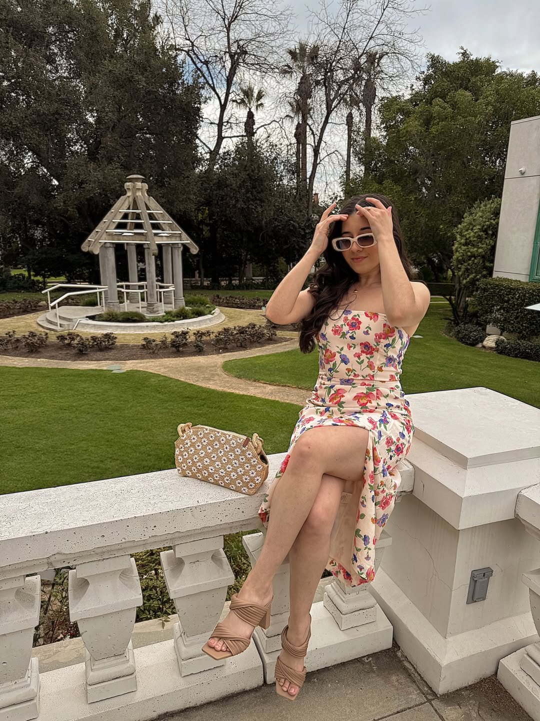 There’s something quietly romantic about a fitted floral dress set against a manicured garden backdrop. The soft print feels almost painted on, echoing the blooms behind her, while the neutral heels and woven bag keep everything grounded in that effortless, sunlit elegance. It’s the kind of look that feels made for slow afternoons and soft conversations.