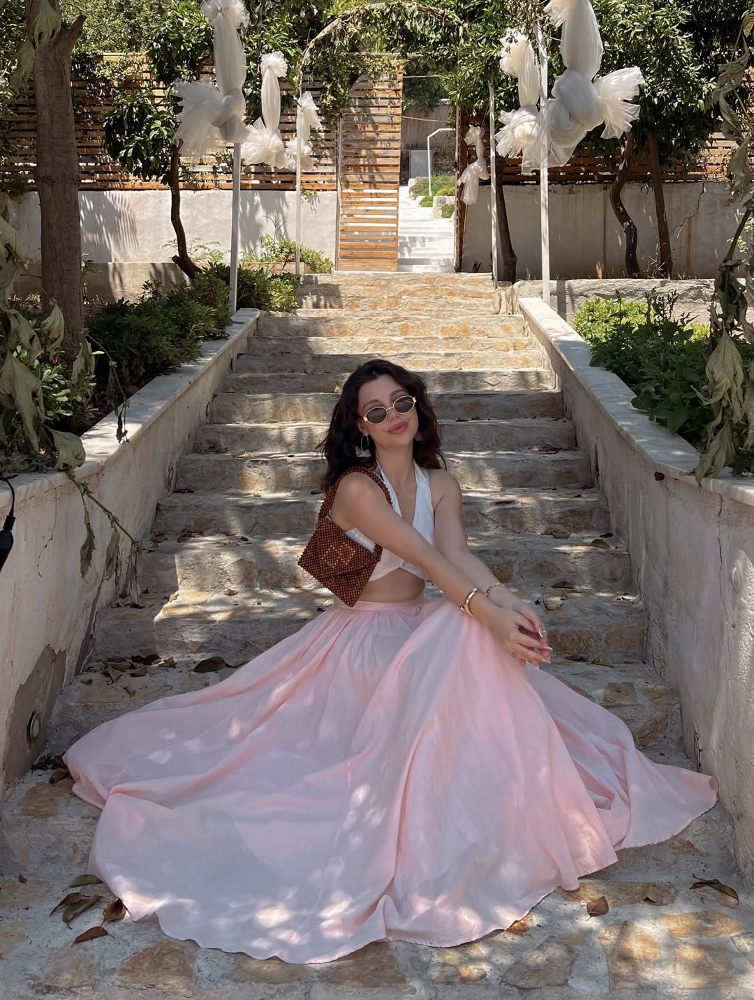 A blush dress styled with delicate surroundings creates a dreamy, almost cinematic feel. The soft tones and feminine silhouette bring a sense of calm elegance.