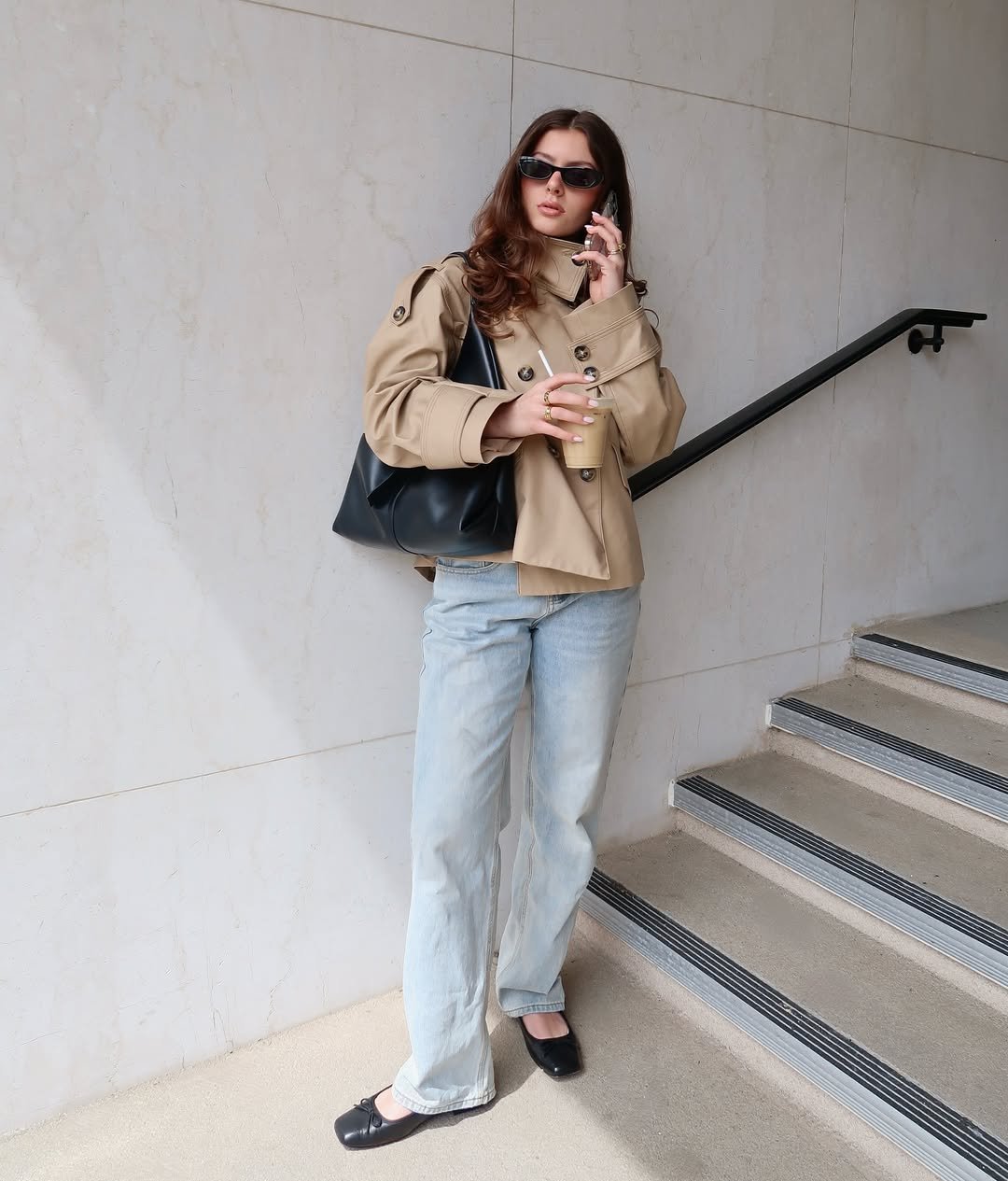 A cropped trench paired with relaxed denim feels like a masterclass in understated dressing. The palette stays within soft neutrals, letting texture and structure do the heavy lifting. Oversized sunglasses and a structured bag bring in that quiet confidence that defines city style.