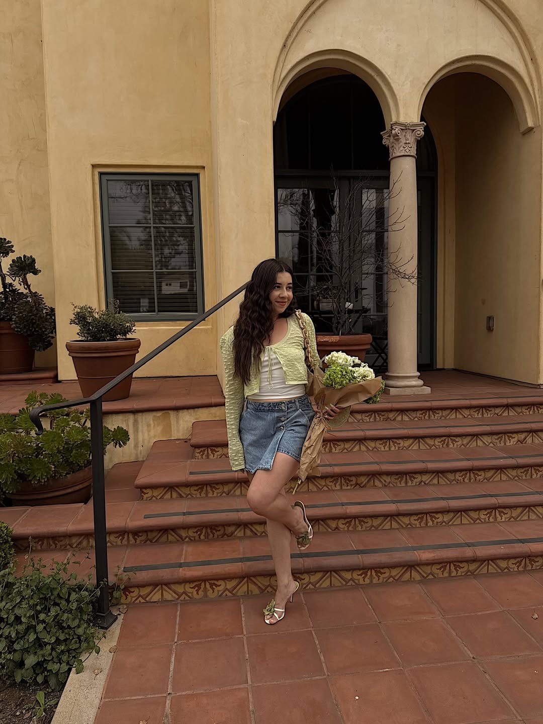 A light green cardigan over a white base instantly brings that fresh, just-picked energy into the outfit. Paired with a denim mini and delicate heels, it feels youthful but still considered, like something you’d wear for a casual lunch that turns into a full afternoon out.