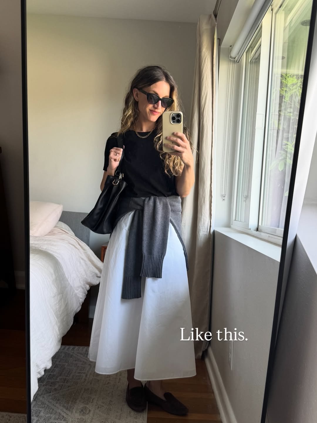 There’s something about a crisp white skirt paired with a simple black tee that feels like a quiet reset for May mornings. The sweater tied at the waist softens everything, adding that layered ease that feels both relaxed and thoughtful.
