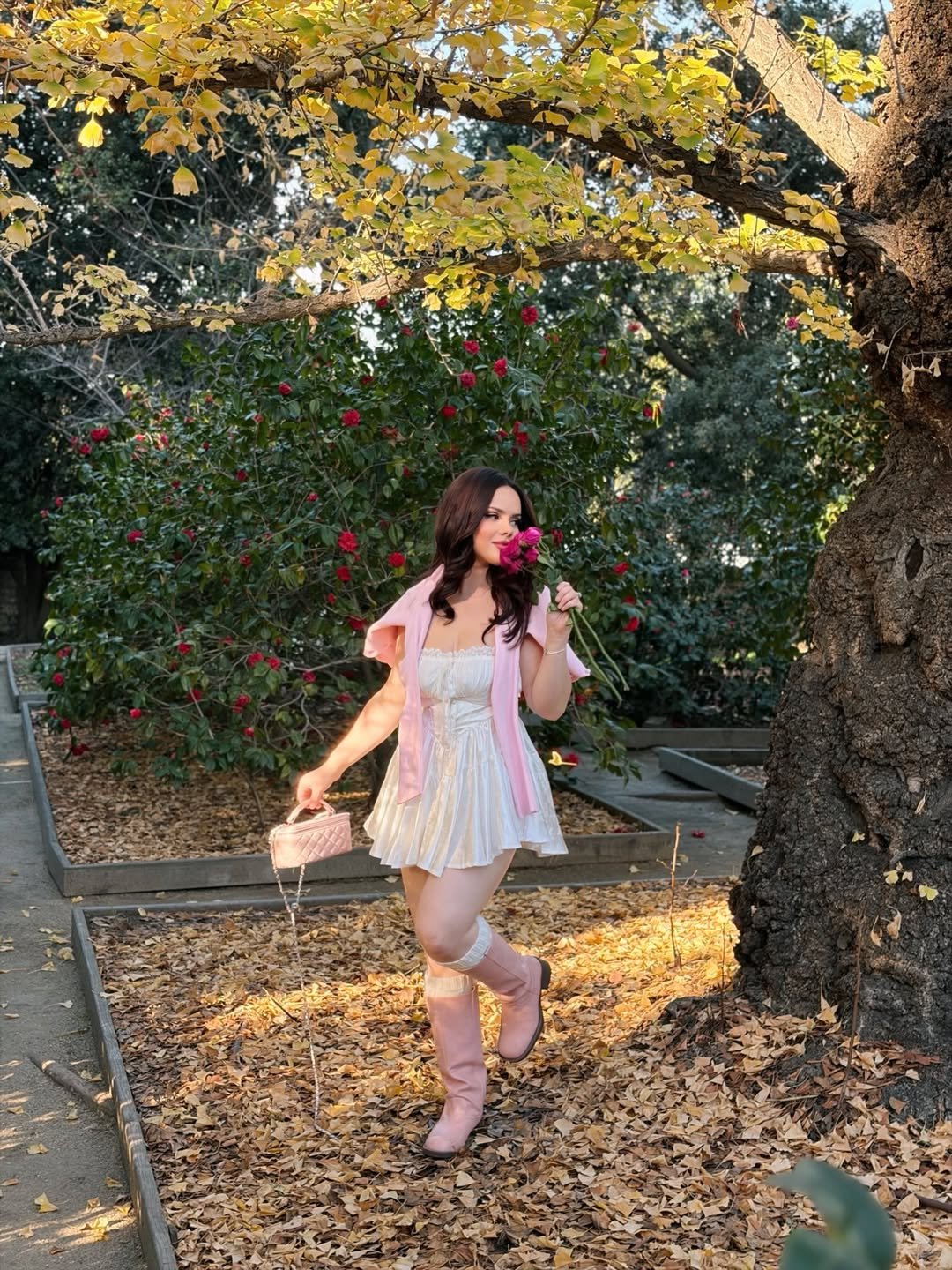 The bouquet adds to the mood, but the real charm is in the layering. Keep knits lightweight and slightly cropped so they frame the outfit instead of overwhelming it. It’s all about balance and a touch of softness.