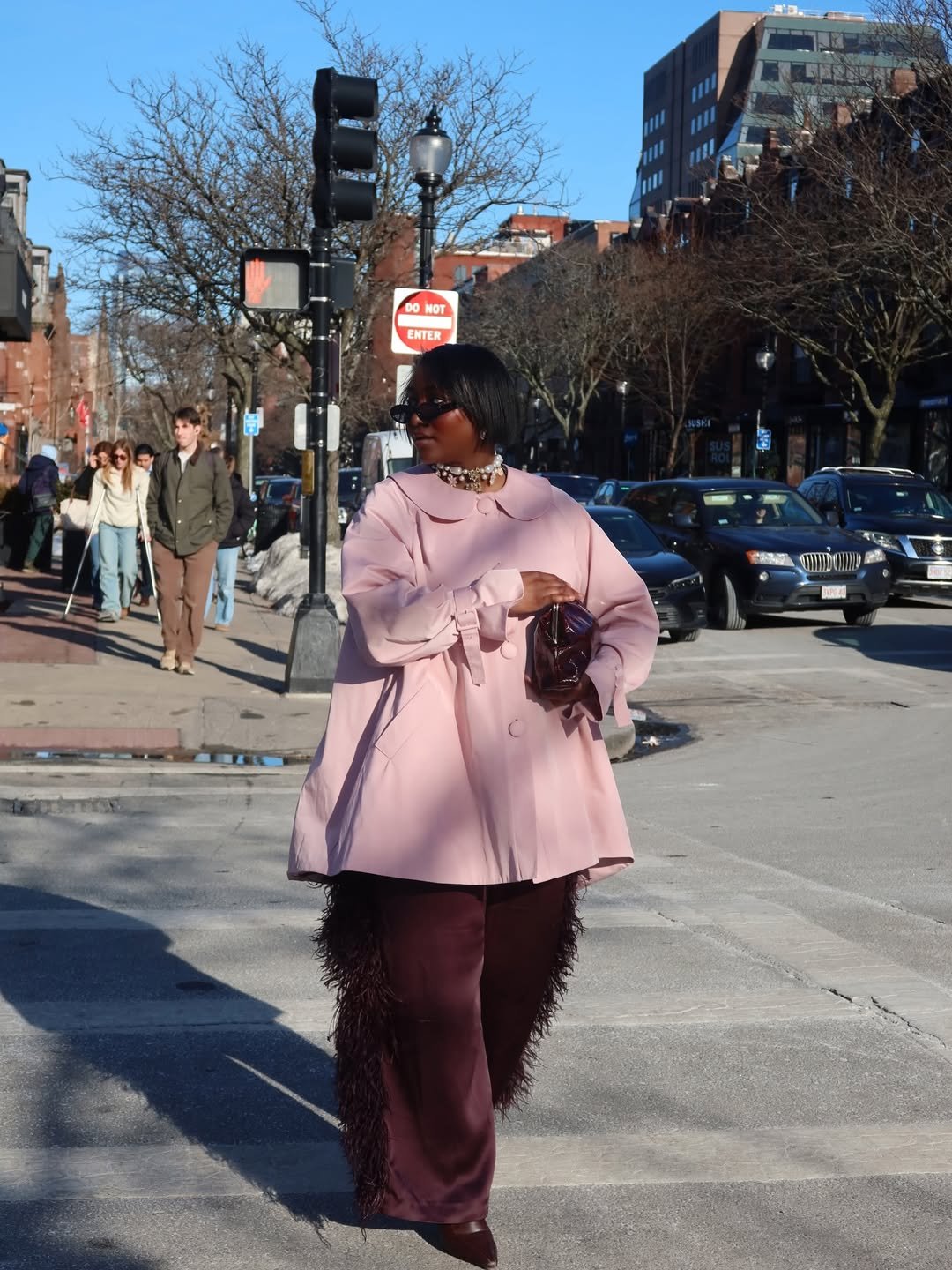 A blush-toned top layered over deeper shades creates a gentle contrast that feels romantic yet grounded. The textures bring dimension, making the whole outfit feel rich without being heavy.