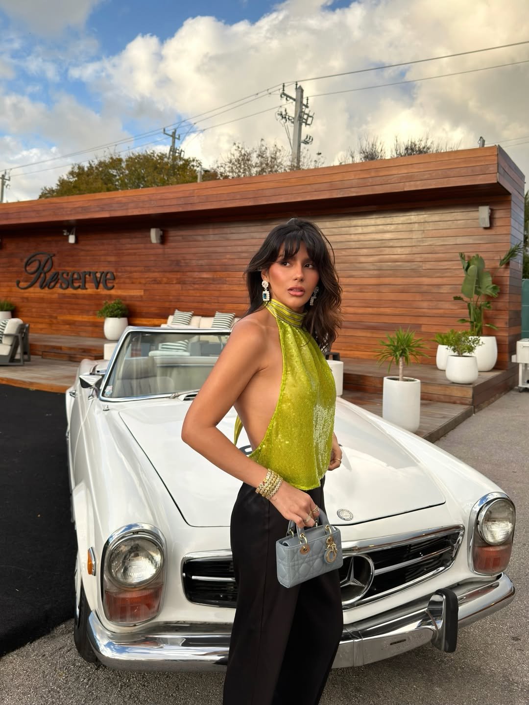 A shimmering lime halter paired with sleek black trousers feels bold, but still refined. The fabric catches the light in a way that turns even a simple stance into a moment.