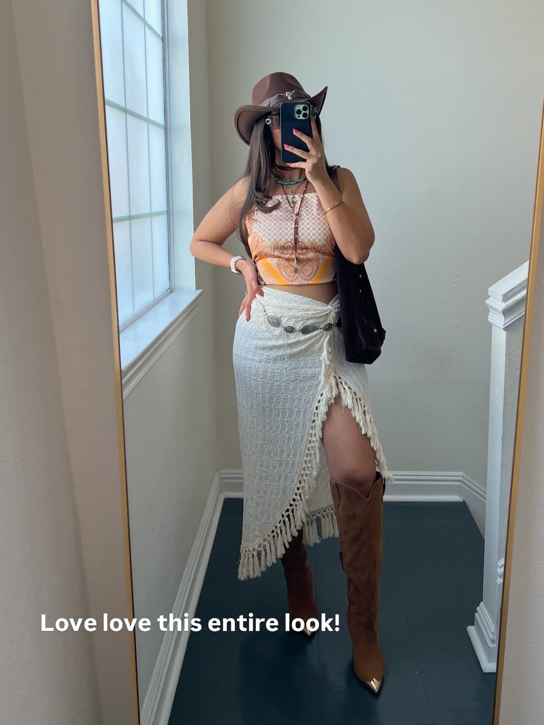 A wrap skirt paired with boots and layered jewelry leans into a modern boho aesthetic. The textures and details give the outfit personality without overwhelming it.