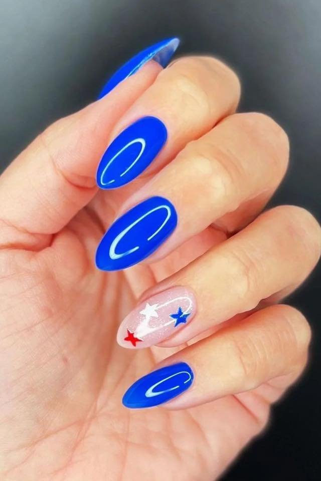 A saturated electric blue across almond-shaped nails instantly commands attention. Then comes the twist: a sheer accent nail dotted with tiny red and white stars.