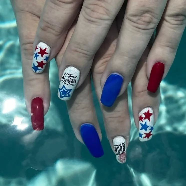 Deep red, vivid blue, and white accent nails covered in stars and “America” details create a strong, confident finish. The longer shape adds drama and presence.