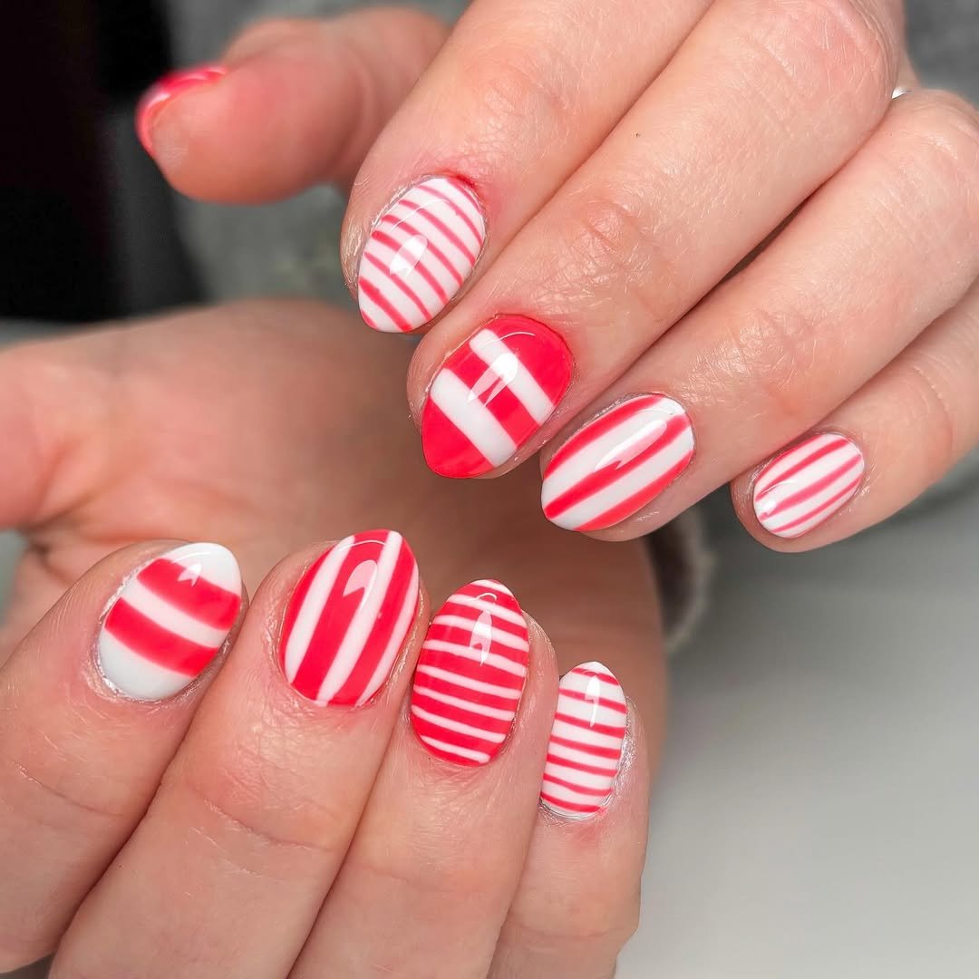 Red and white stripes in varying widths create a playful, almost candy-inspired pattern across each nail. The alternating directions keep it visually interesting without overwhelming.