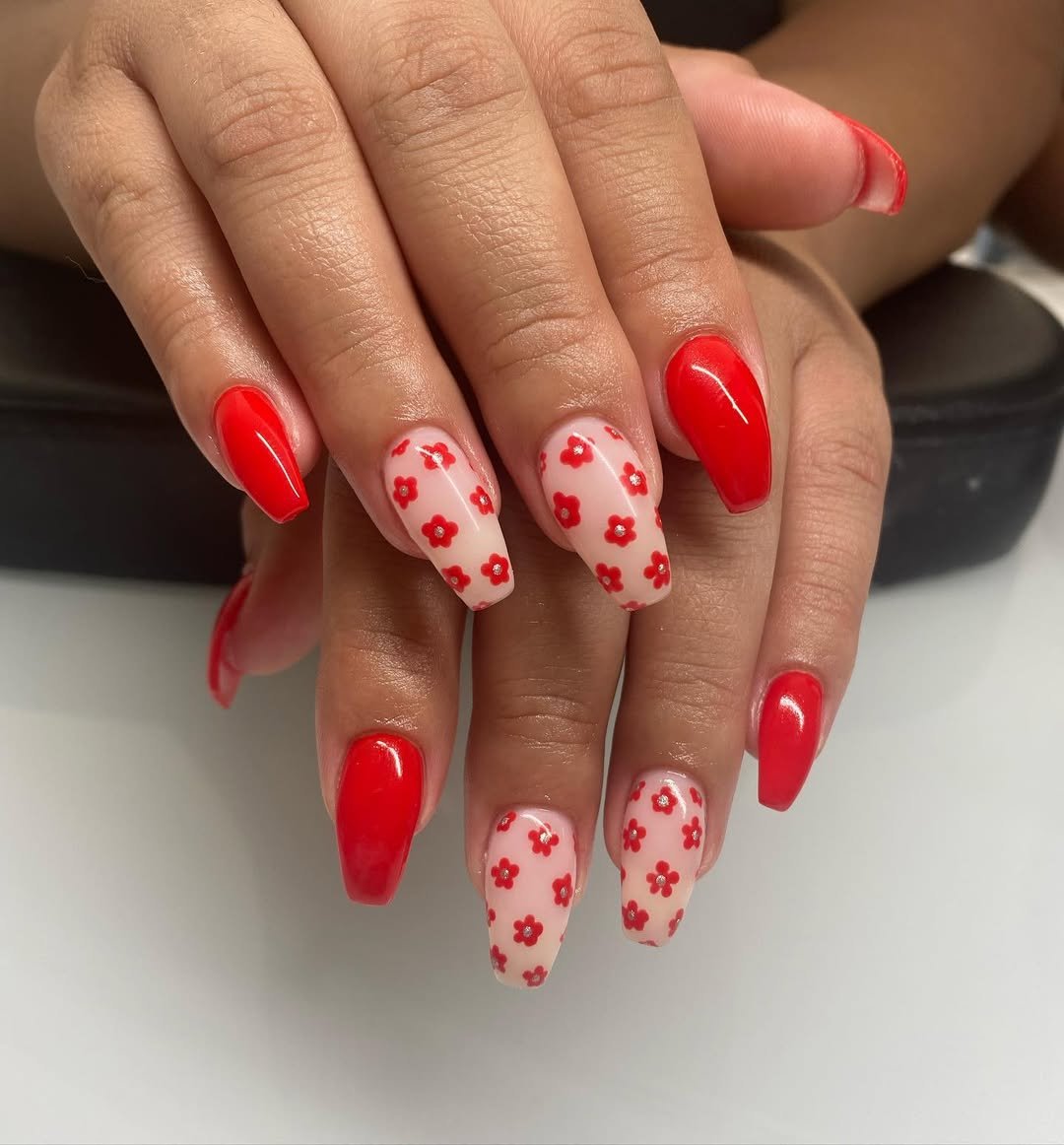 Glossy, punchy red nails meet a soft blush base scattered with tiny red florals. It feels sweet but not sugary, like fresh-cut flowers set against crisp white linen.