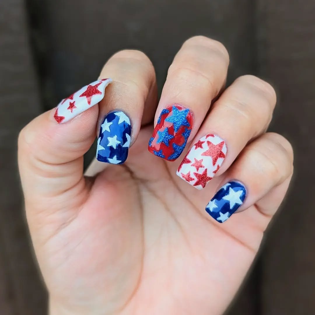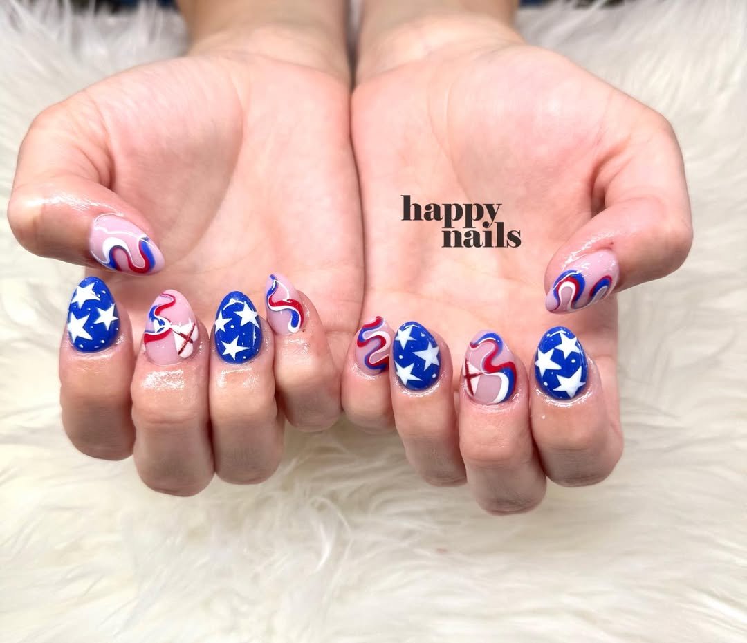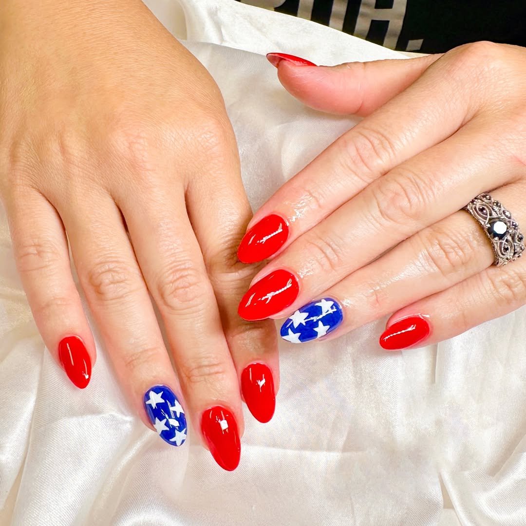 Glossy fire-engine red meets a bold blue accent packed with crisp white stars. The almond shape keeps it elegant, while the color story leans all the way into patriotic pride.