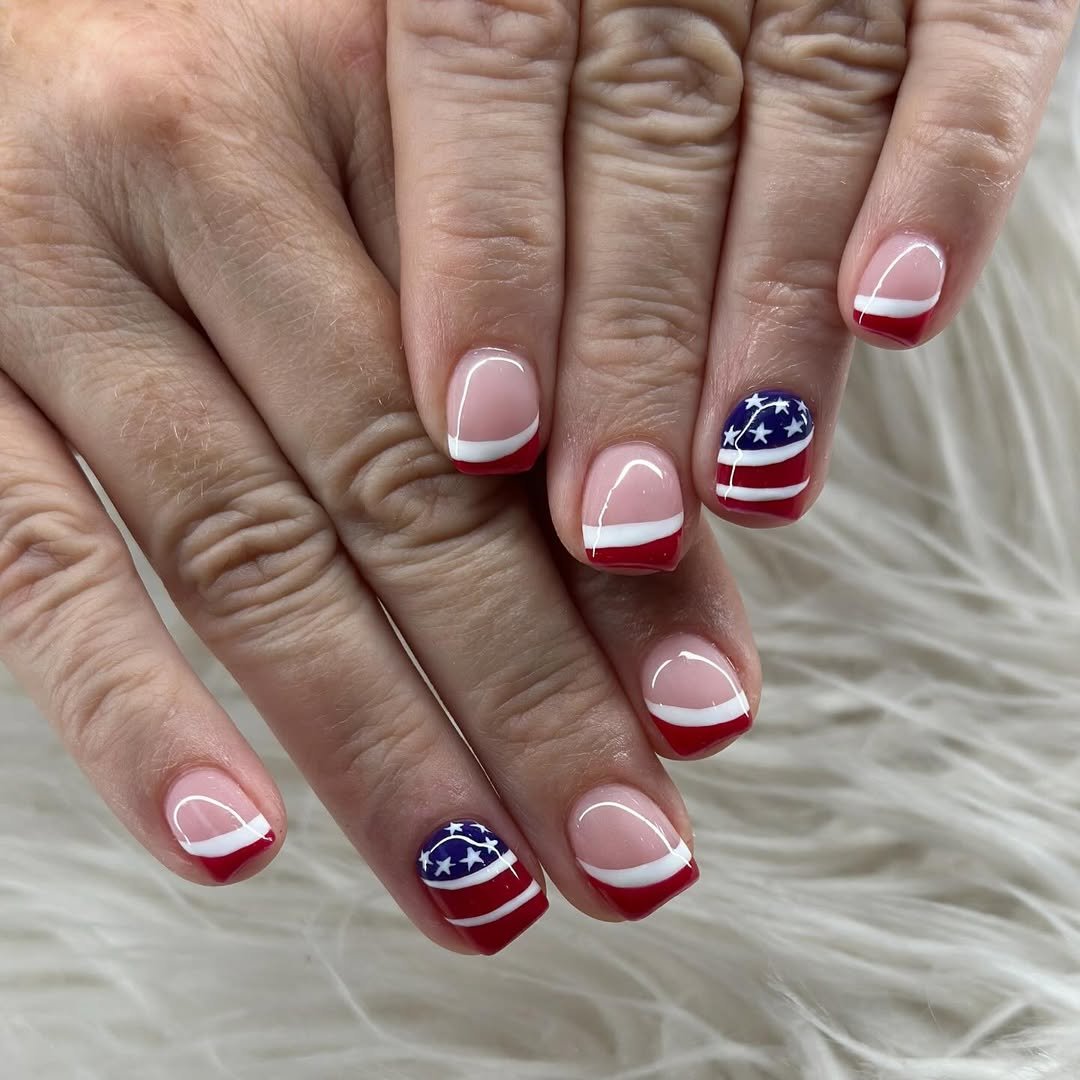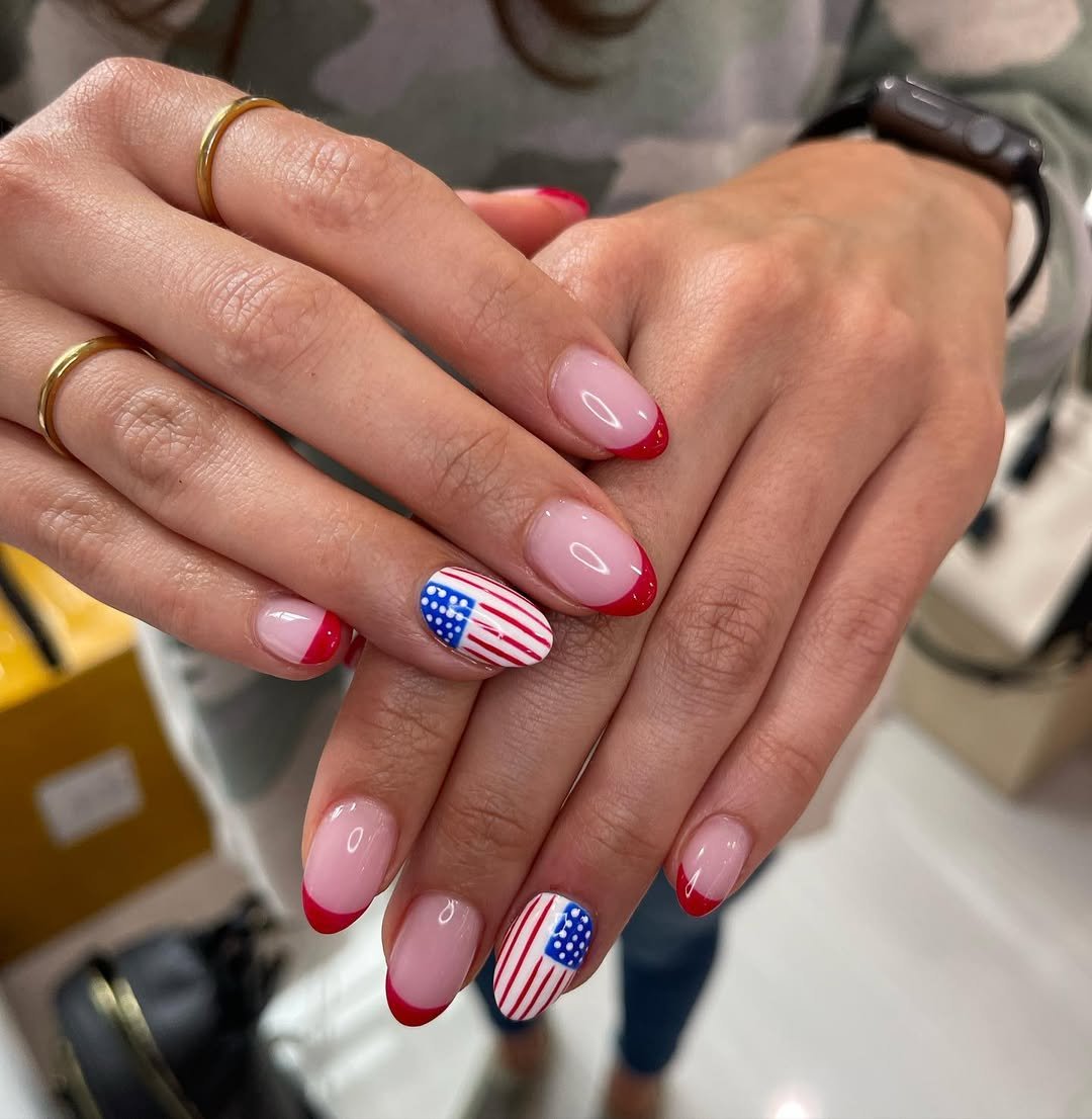 Soft pink bases with curved red-and-white French tips keep things clean and feminine. Then comes the statement nail with a miniature flag detail that ties it all together.