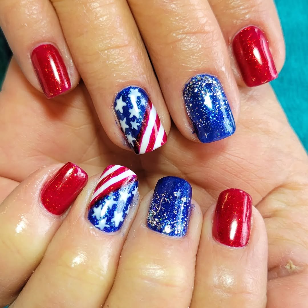 Short square nails get a bold makeover with glittering red and deep blue polish. Accent nails recreate the American flag with sparkly stripes and star details.
