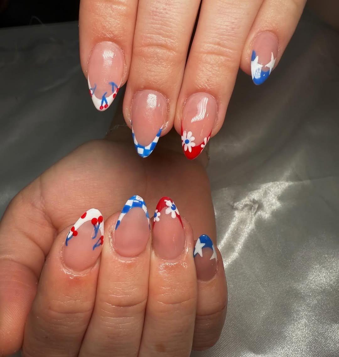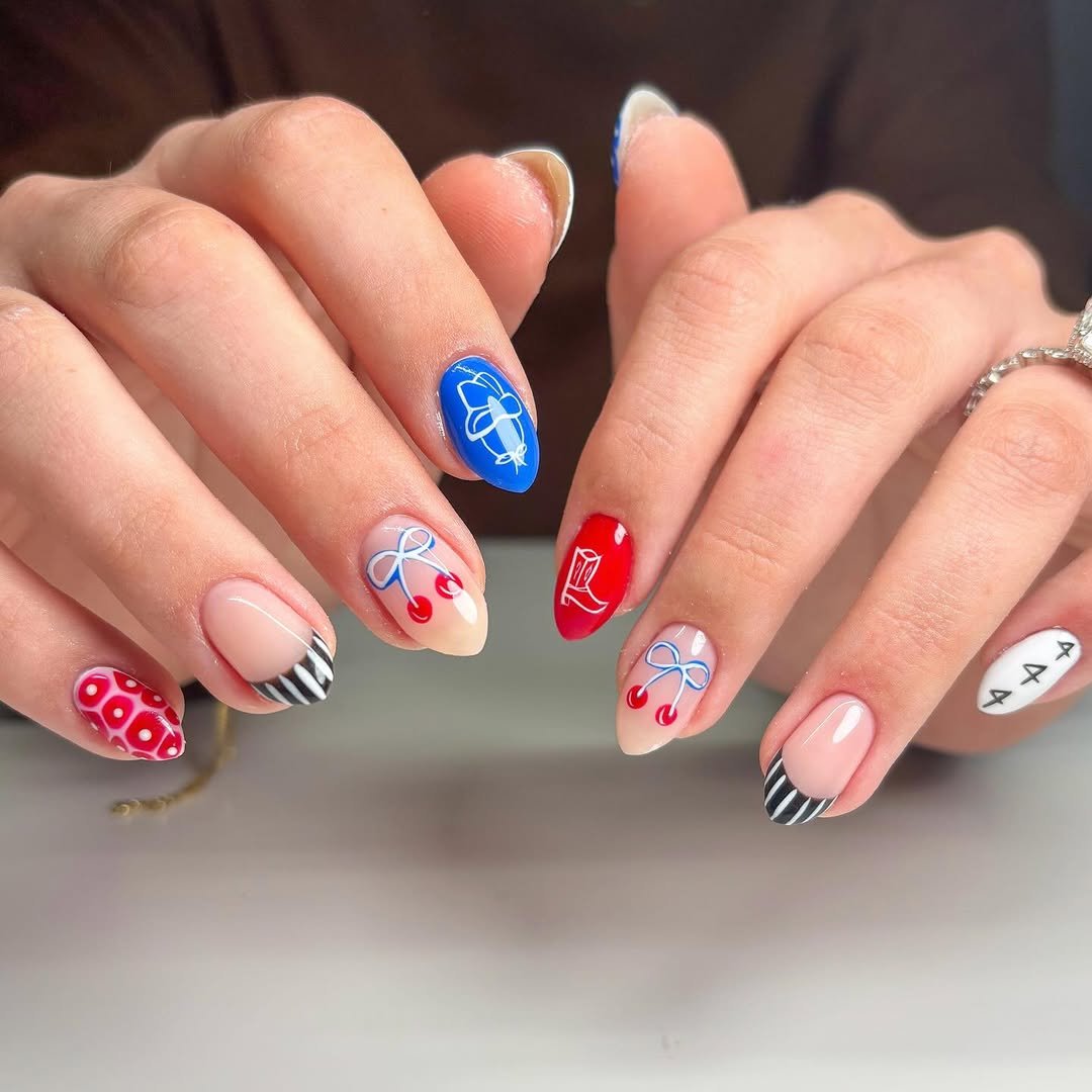Soft almond shapes with playful red and blue French tips, tiny cherries, gingham details, and dainty florals. Each nail feels like a different chapter of a summer story.
