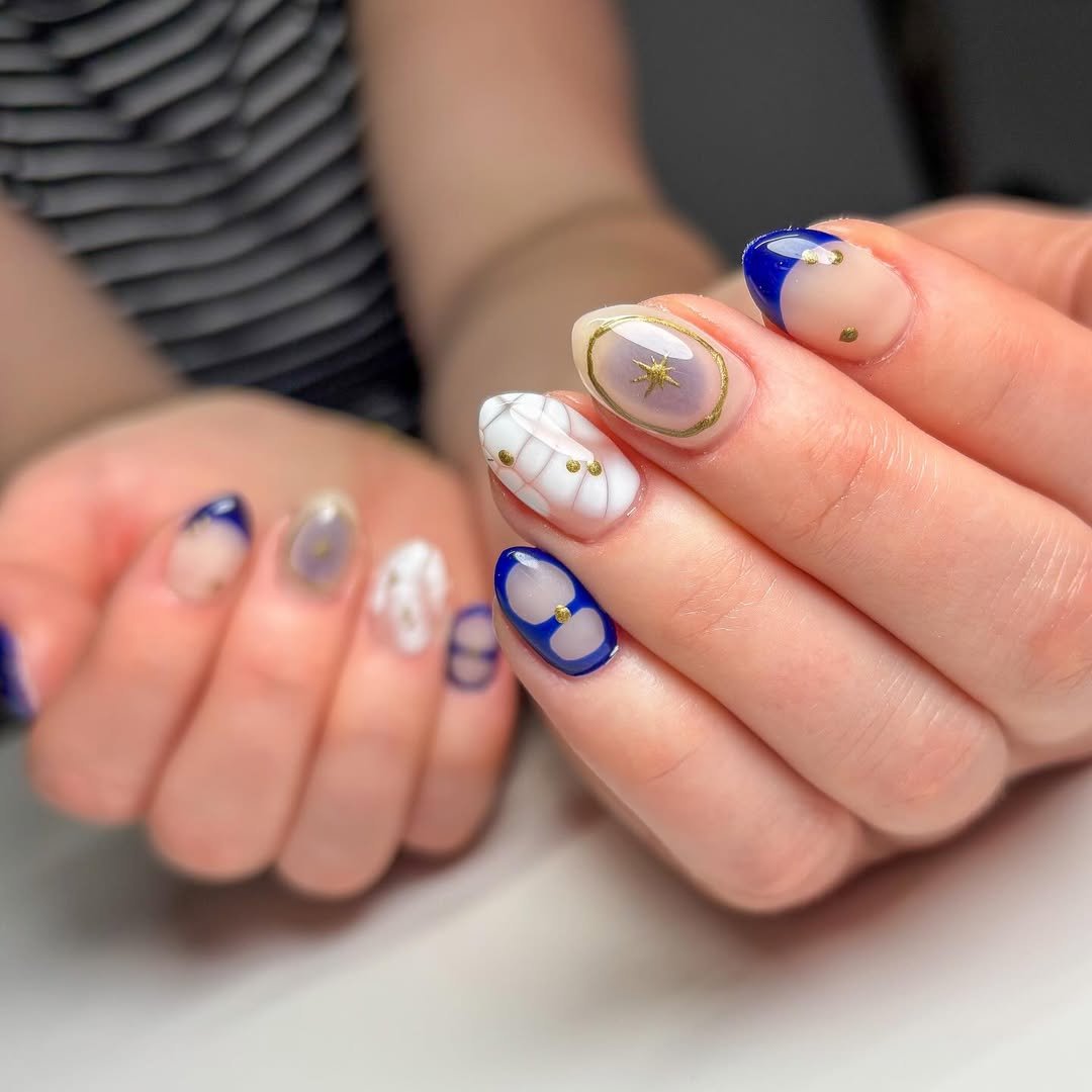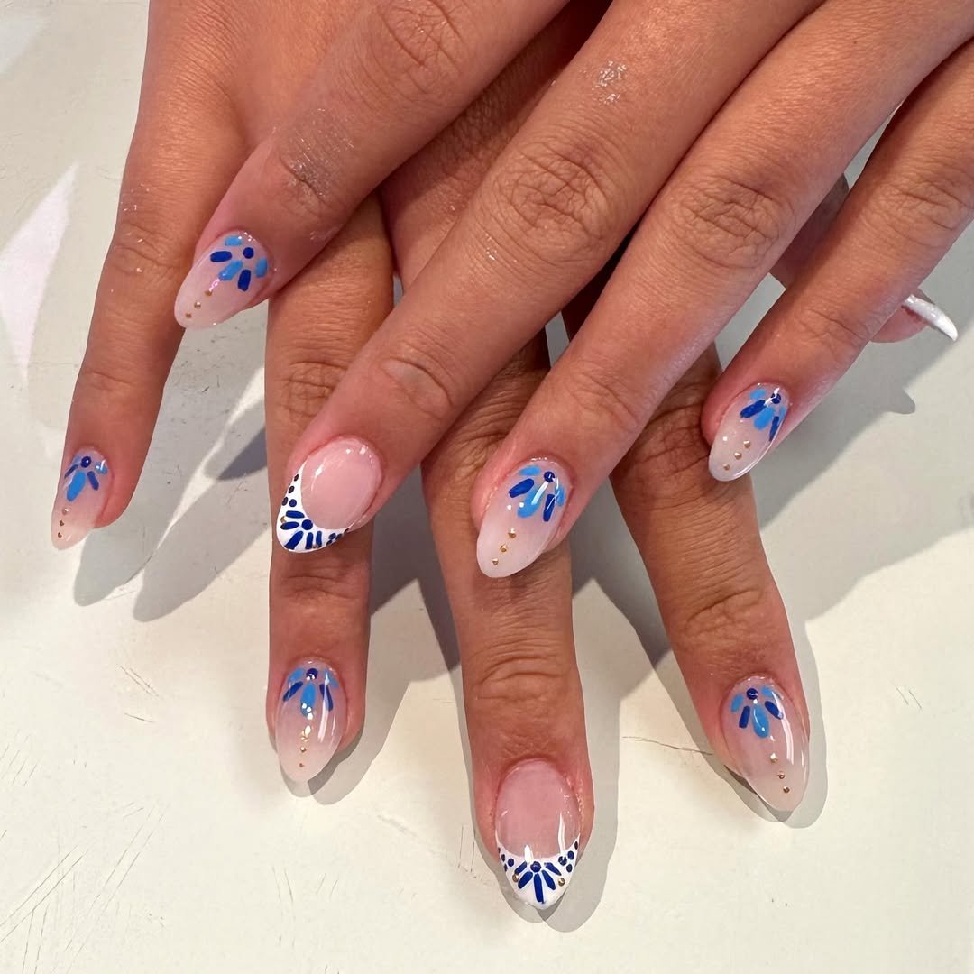 Soft nude bases meet scattered cobalt petals, and the result feels like a picnic blanket translated into nail art. Tiny gold studs add that subtle glint, like sunlight catching your glass at brunch.