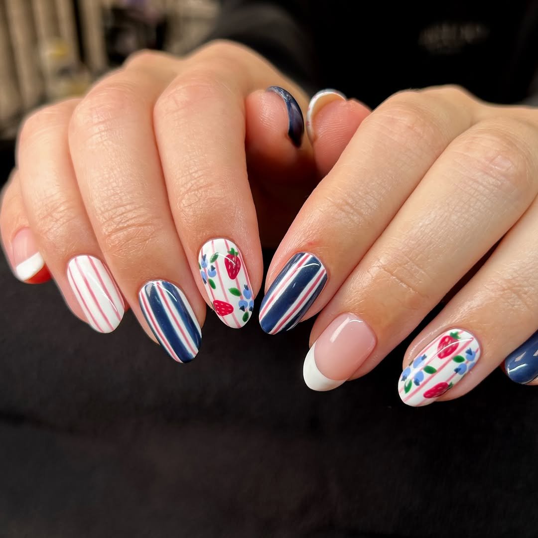 Red and navy stripes meet delicate strawberry accents and a crisp white French tip. It leans into Americana in a softer, coastal way.