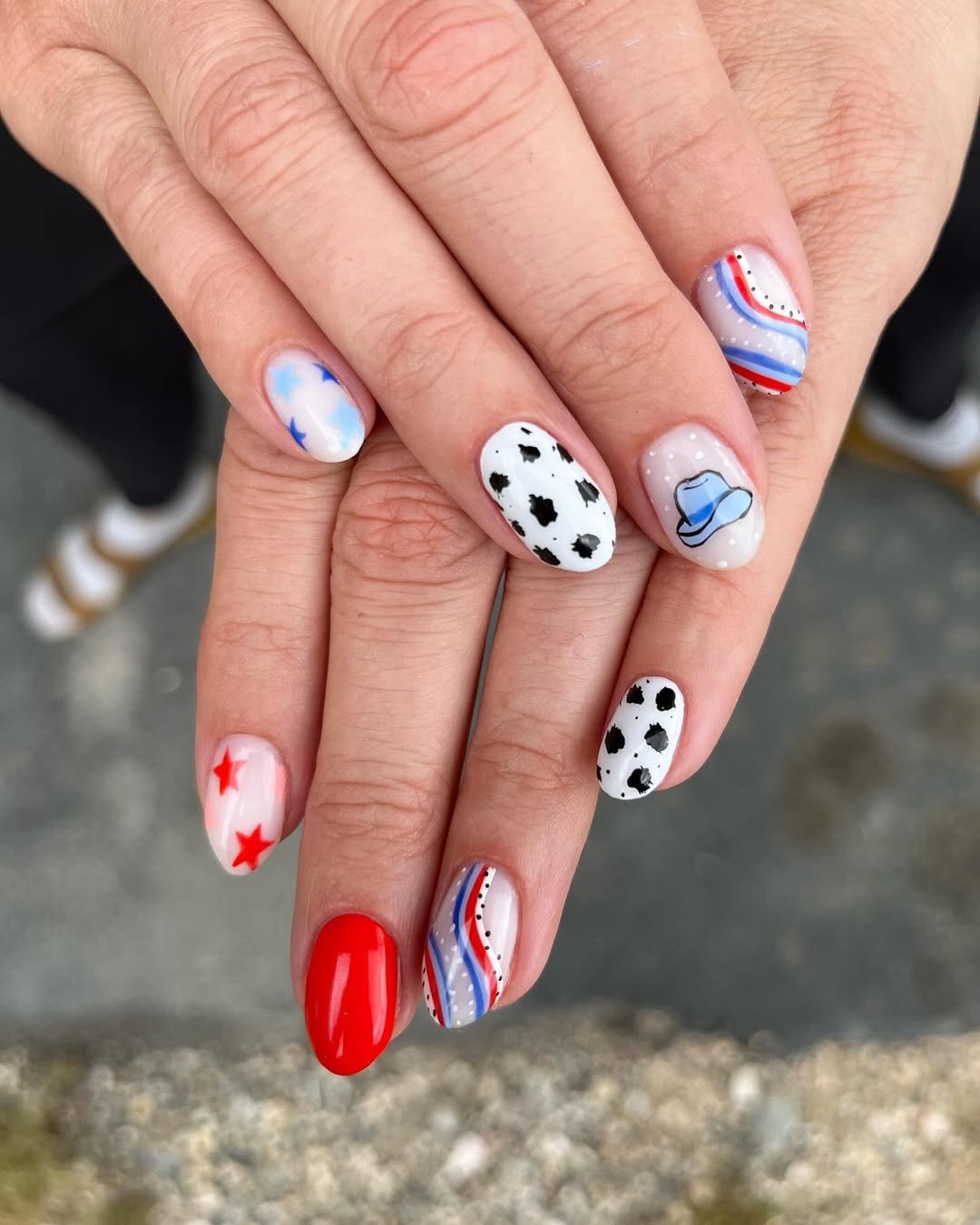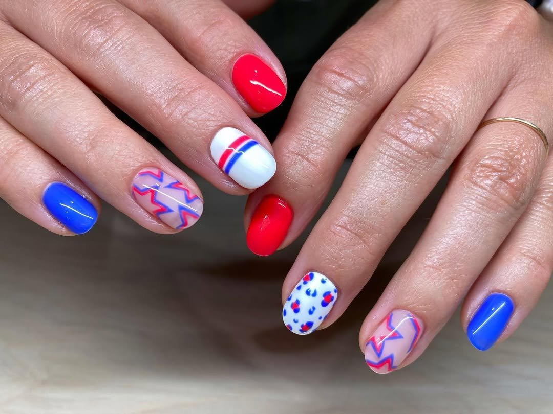 This set feels like a curated collage: red stars, wavy red and blue lines, even a tiny blue hat detail that adds personality. Each nail tells a slightly different story.